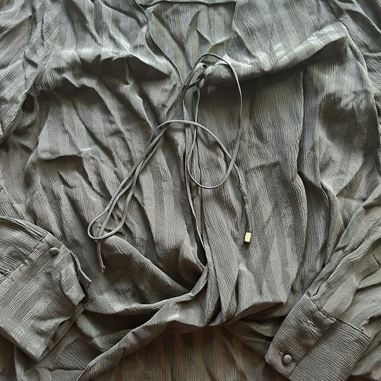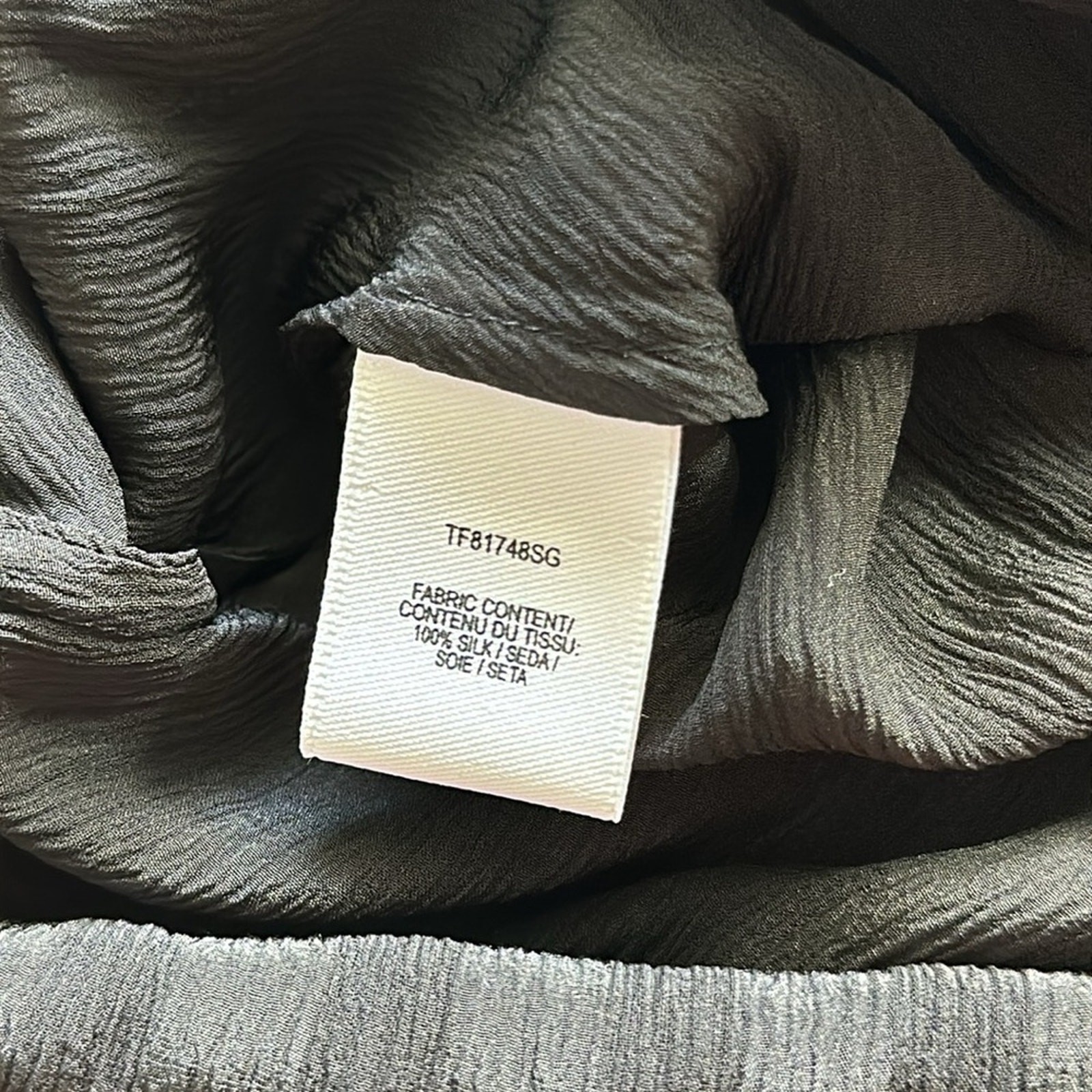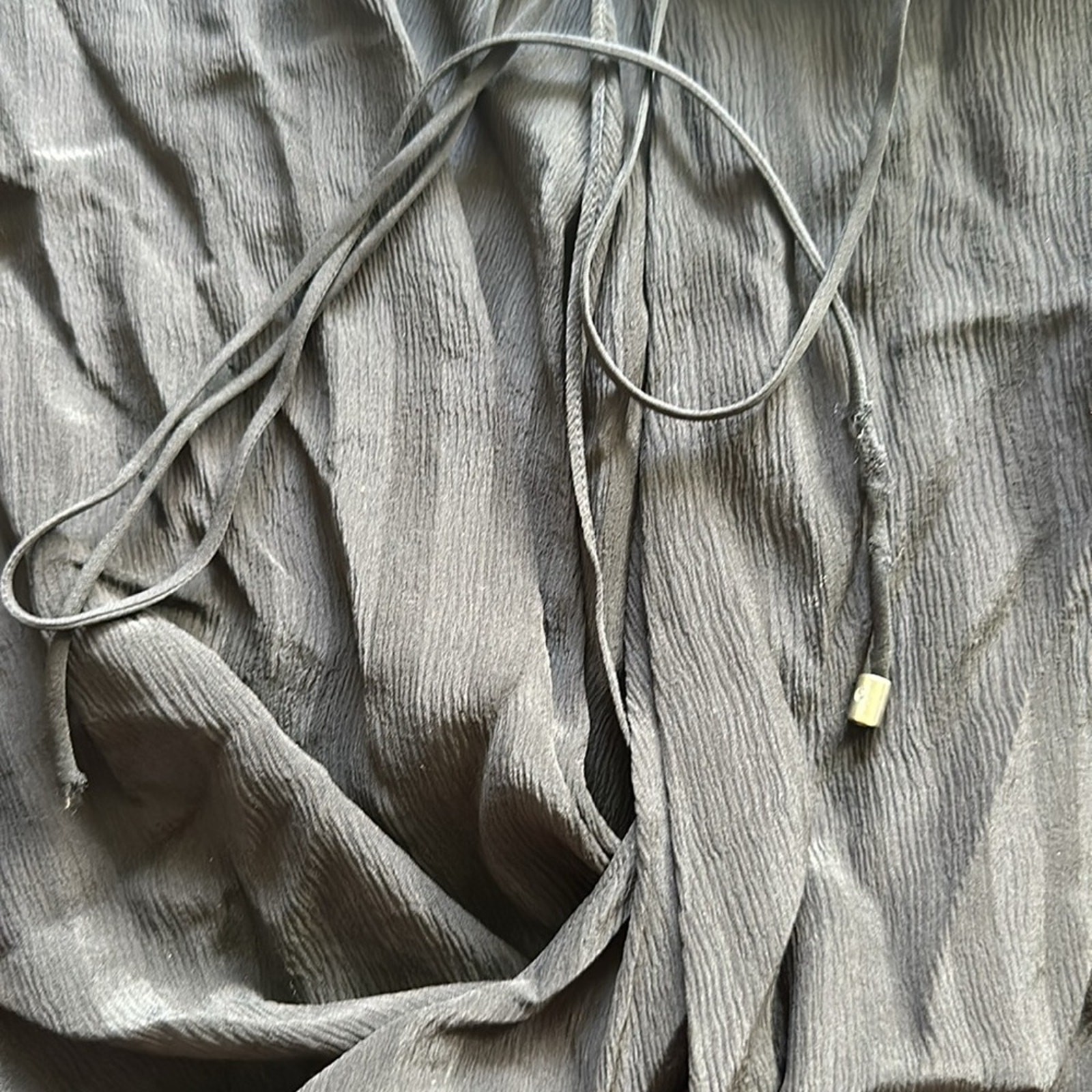 Great preowned condition No holes or stains One tie is frayed and missing end metal piece Size: 2 -100% Silk -Sheer with solid stripes -Deep V -Neck can be tied to your choice with tie -Twist bottom -Long sleeves