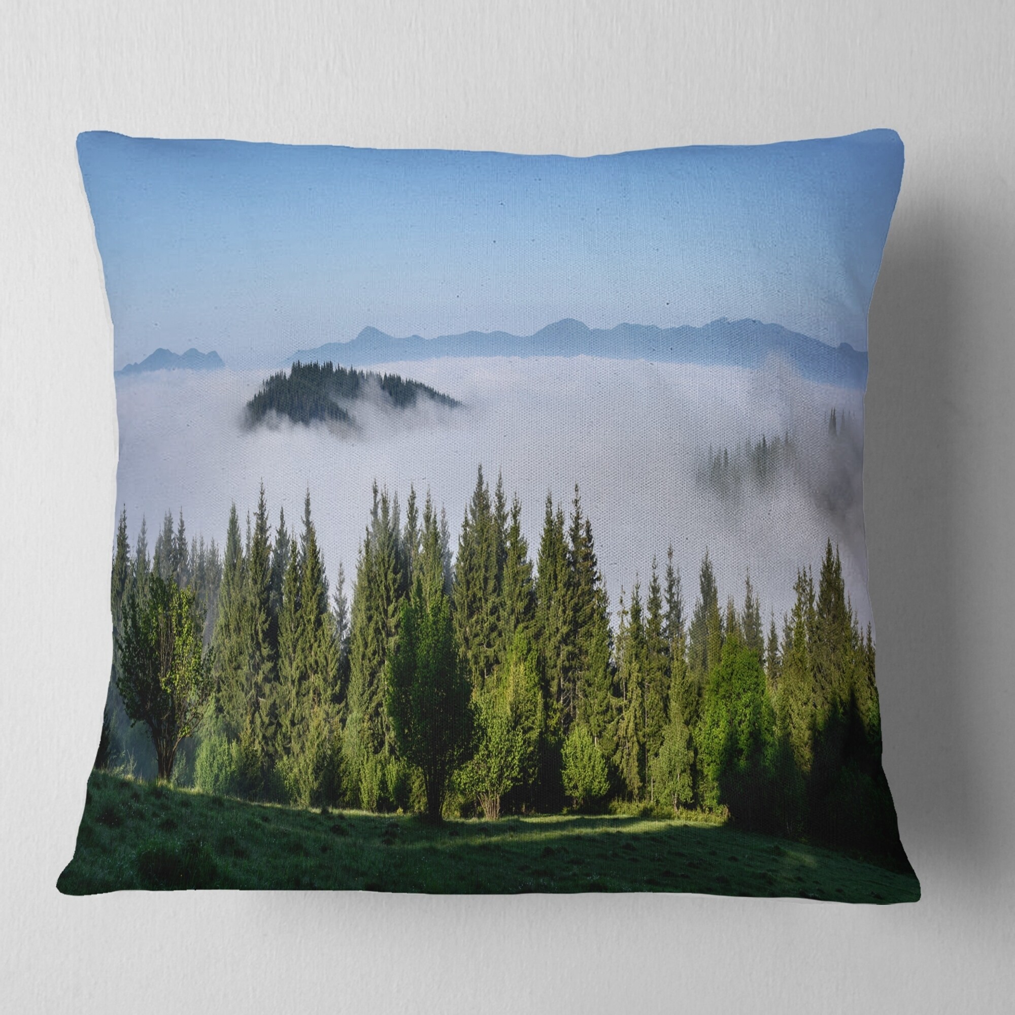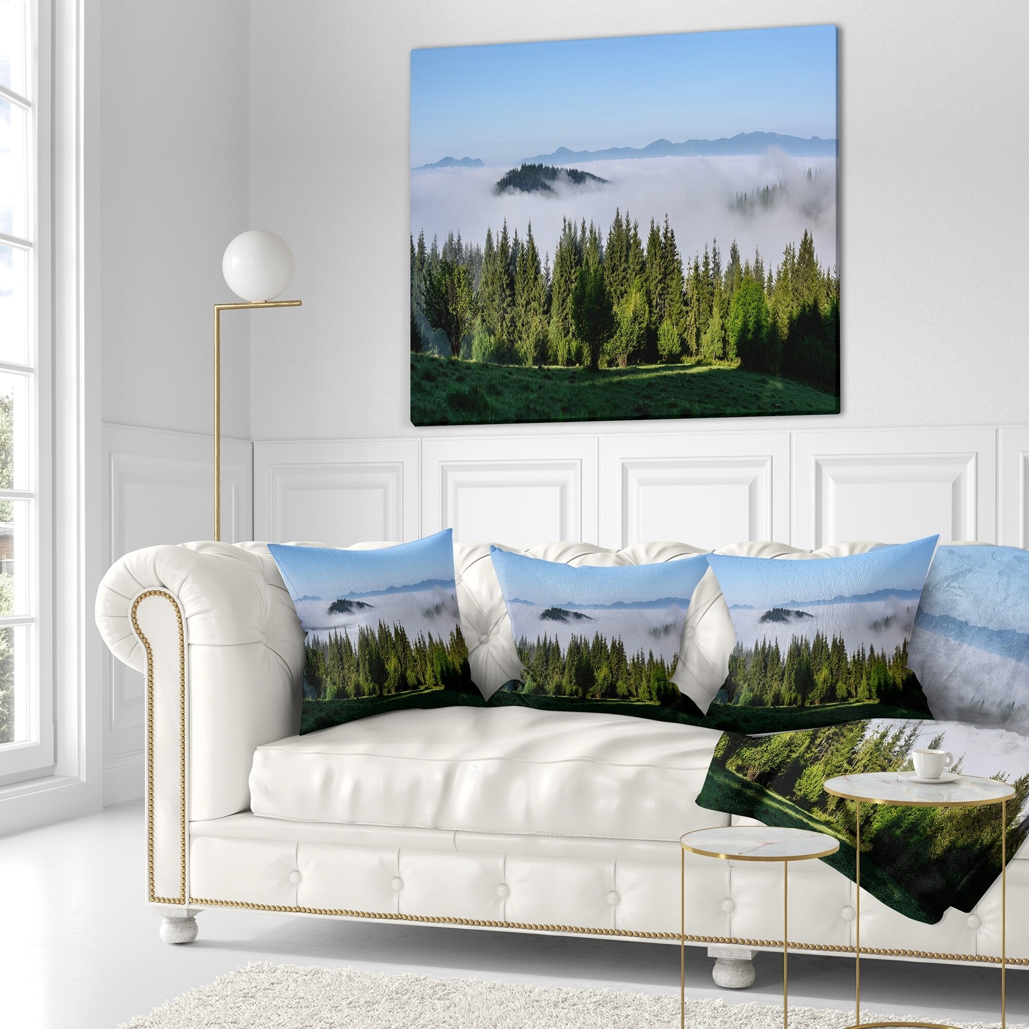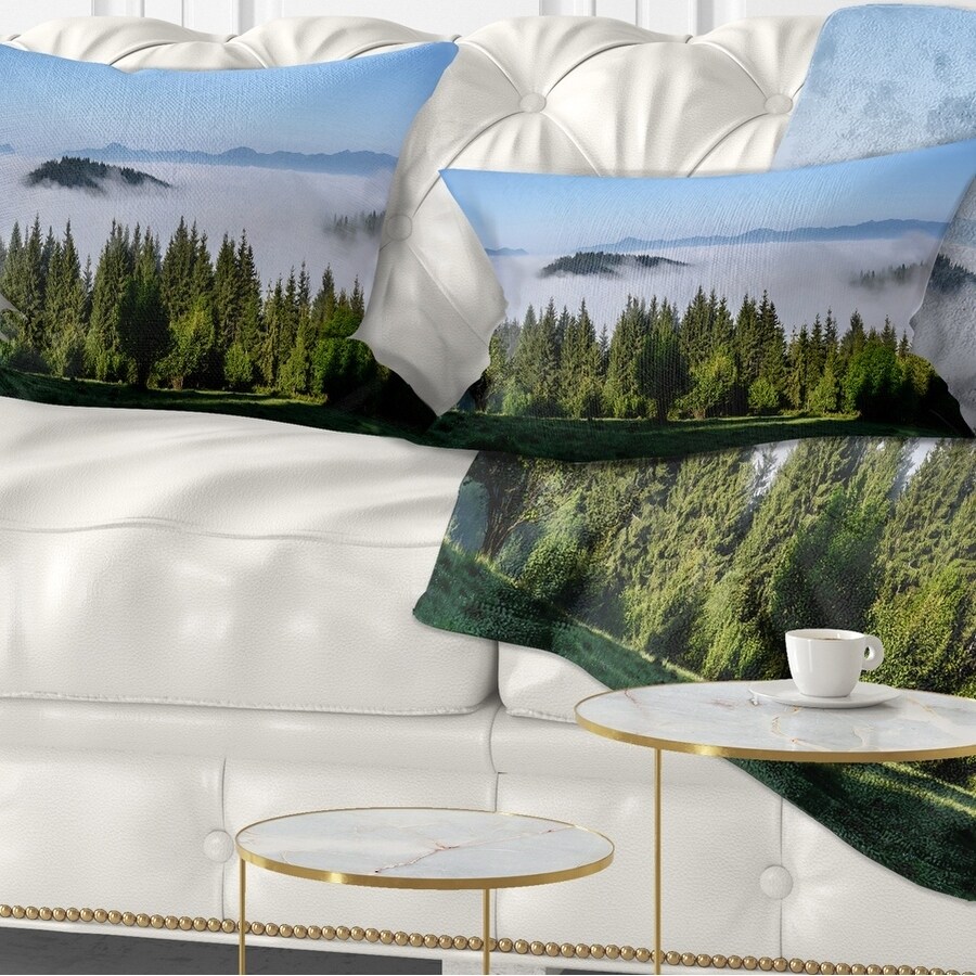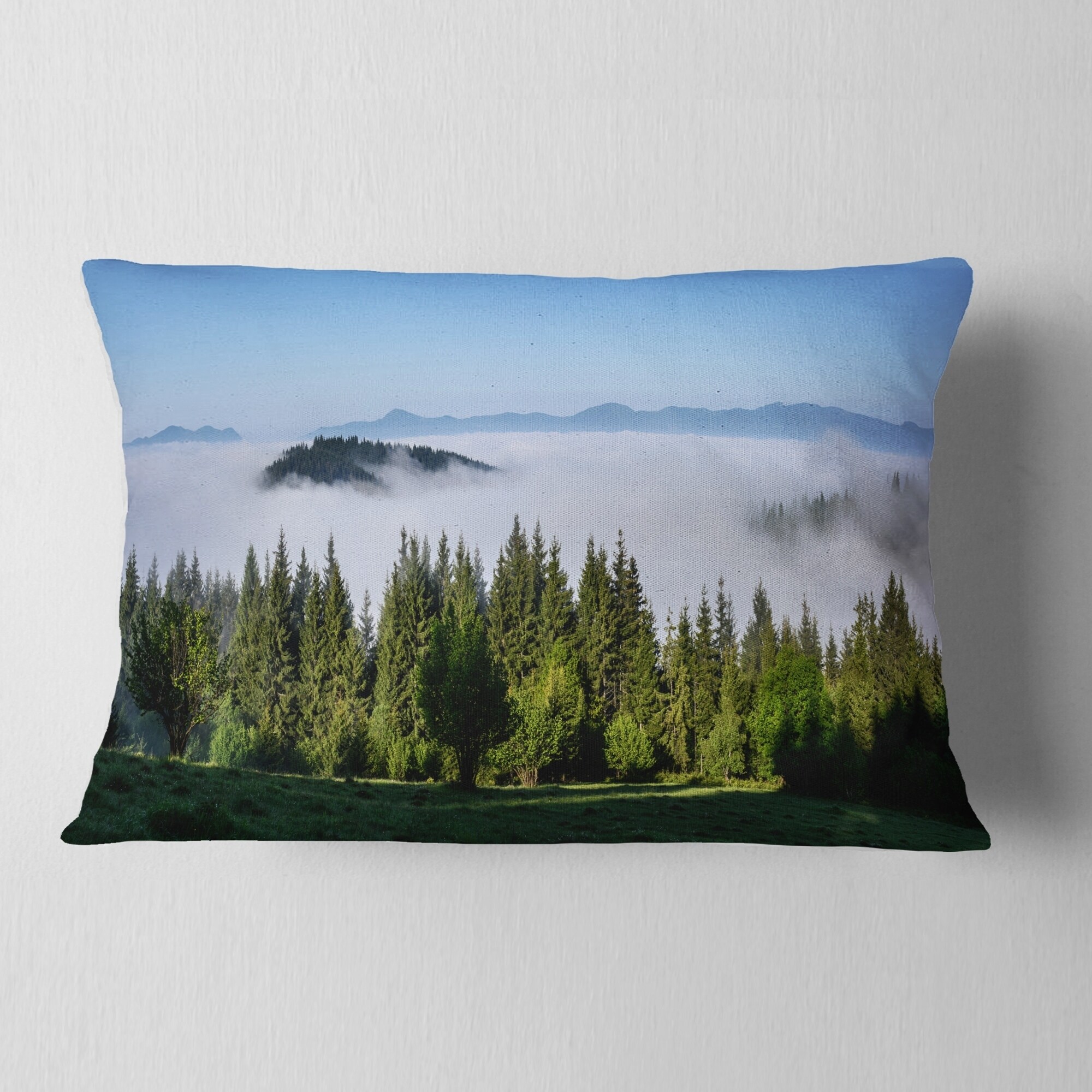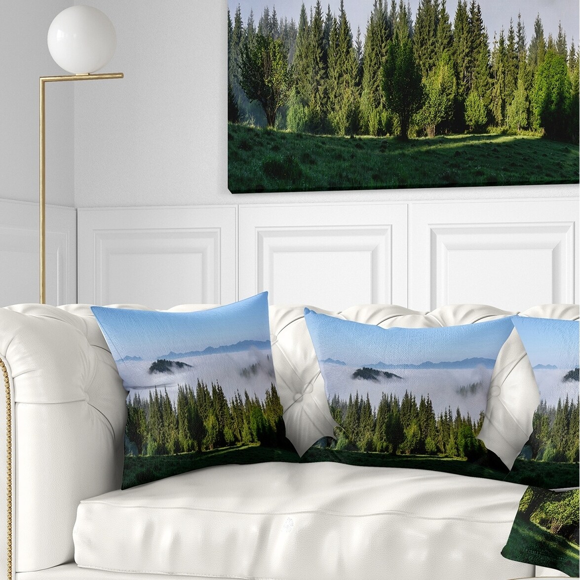 Decorative Throw Pillows for Couch Bed Sofa with Zip CoversAn easy, fun way to add a pop of color or bring new life to any room in your home or office is with these beautiful Landscape throw pillows. Dress up your bed, sofa or lounger with this decorative design art pillows. Perfect as Farmhouse bedroom décor, lounge décor Traditional living room décor. It adds a fun accent to any room. Throw pillows really do work wonders: they can transform any room from uninviting discomfort to warm and welcoming. And they really do go almost anywhere - arrange a couple on the couch or sofa, place one in your overstuffed chair for extra coziness, toss a couple on the bed and prop yourself up for a great read.These Landscapes pillow is printed using High Color Density Italian inks to create a vibrantly Free Shipping Over $49.99* Details Designart 'Green Trees and Fog Over Mountains' Landscape Printed Throw Pillow Product Description: Decorative Throw Pillows for Couch Bed Sofa with Zip Covers An easy, fun way to add a pop of color or bring new life to any room in your home or office is with these beautiful Landscape throw pillows. Dress up your bed, sofa or lounger with this decorative design art pillows. Perfect as Farmhouse bedroom décor, lounge décor Traditional living room décor. It adds a fun accent to any room. Throw pillows really do work wondersthey can transform any room from uninviting discomfort to warm and welcoming. And they really do go almost anywhere - arrange a couple on the couch or sofa, place one in your overstuffed chair for extra coziness, toss a couple on the bed and prop yourself up for a great read. These Landscapes pillow is printed using High Color Density Italian inks to create a vibrantly colored, sharp artwork. Features: Perfect accent to any furniture piece Basic shapes with a modern graphic design twist Printed on 100% light weight polyester Cushion filled with 100% polyester fill Wrinkle resistant fabric Zip Closure so you can remove the pillow from its' cover Down-like comfort - Odorless 100% Hypoallergenic Machine Wash Cold Separately, Gently Cycle Only, No bleach, hang to dry Print on Demand with High Density Italian Ink Available in Several sizes Attribute :Farmhouse, Traditional, Fine Art Giclee Subject Landscapes, Country Charrm, photography