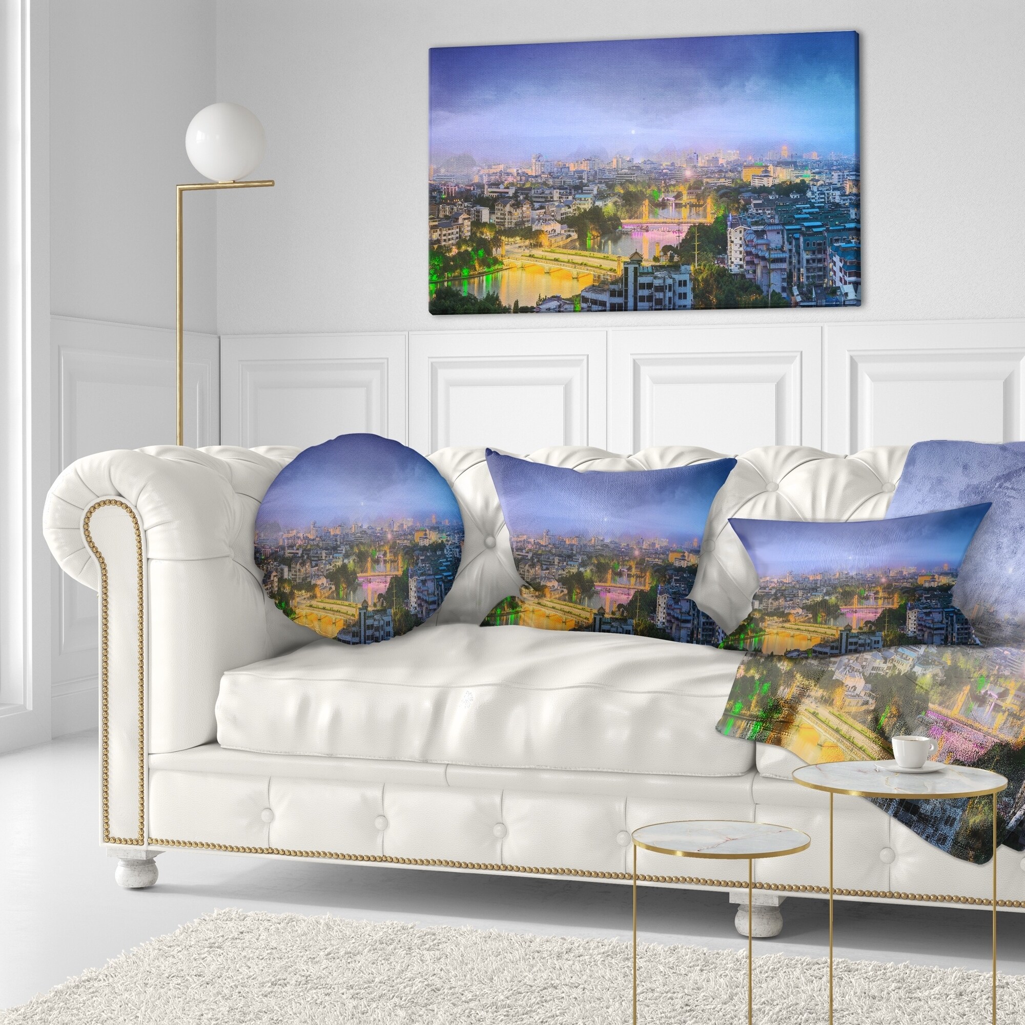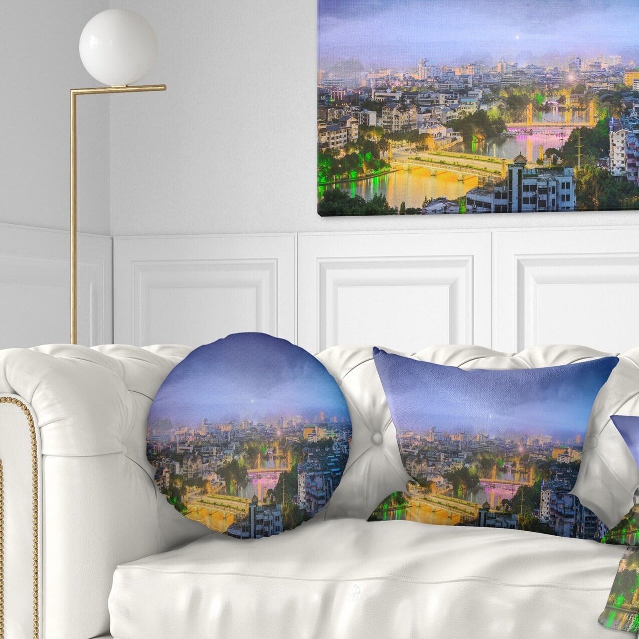 Decorative Throw Pillows for Couch Bed Sofa with Zip CoversAn easy, fun way to add a pop of color or bring new life to any room in your home or office is with these beautiful Cityscape throw pillows. Dress up your bed, sofa or lounger with this decorative design art pillows. Perfect as Industrial bedroom décor, lounge décor Panoramic Art living room décor. It adds a fun accent to any room. Throw pillows really do work wonders: they can transform any room from uninviting discomfort to warm and welcoming. And they really do go almost anywhere - arrange a couple on the couch or sofa, place one in your overstuffed chair for extra coziness, toss a couple on the bed and prop yourself up for a great read.These Architecture pillow is printed using High Color Density Italian inks to create a Free Shipping Over $49.99* Details Designart 'Li River and Karst Hills Panorama' Cityscape Throw Pillow Product Description: Decorative Throw Pillows for Couch Bed Sofa with Zip Covers An easy, fun way to add a pop of color or bring new life to any room in your home or office is with these beautiful Cityscape throw pillows. Dress up your bed, sofa or lounger with this decorative design art pillows. Perfect as Industrial bedroom décor, lounge décor Panoramic Art living room décor. It adds a fun accent to any room. Throw pillows really do work wondersthey can transform any room from uninviting discomfort to warm and welcoming. And they really do go almost anywhere - arrange a couple on the couch or sofa, place one in your overstuffed chair for extra coziness, toss a couple on the bed and prop yourself up for a great read. These Architecture pillow is printed using High Color Density Italian inks to create a vibrantly colored, sharp artwork. Features: Perfect accent to any furniture piece Basic shapes with a modern graphic design twist Printed on 100% light weight polyester Cushion filled with 100% polyester fill Wrinkle resistant fabric Zip Closure so you can remove the pillow from its' cover Down-like comfort - Odorless 100% Hypoallergenic Machine Wash Cold Separately, Gently Cycle Only, No bleach, hang to dry Print on Demand with High Density Italian Ink Available in Several sizes Attribute :Industrial, Panoramic Art, Modern Subject Architecture, Cityscapes, Photography