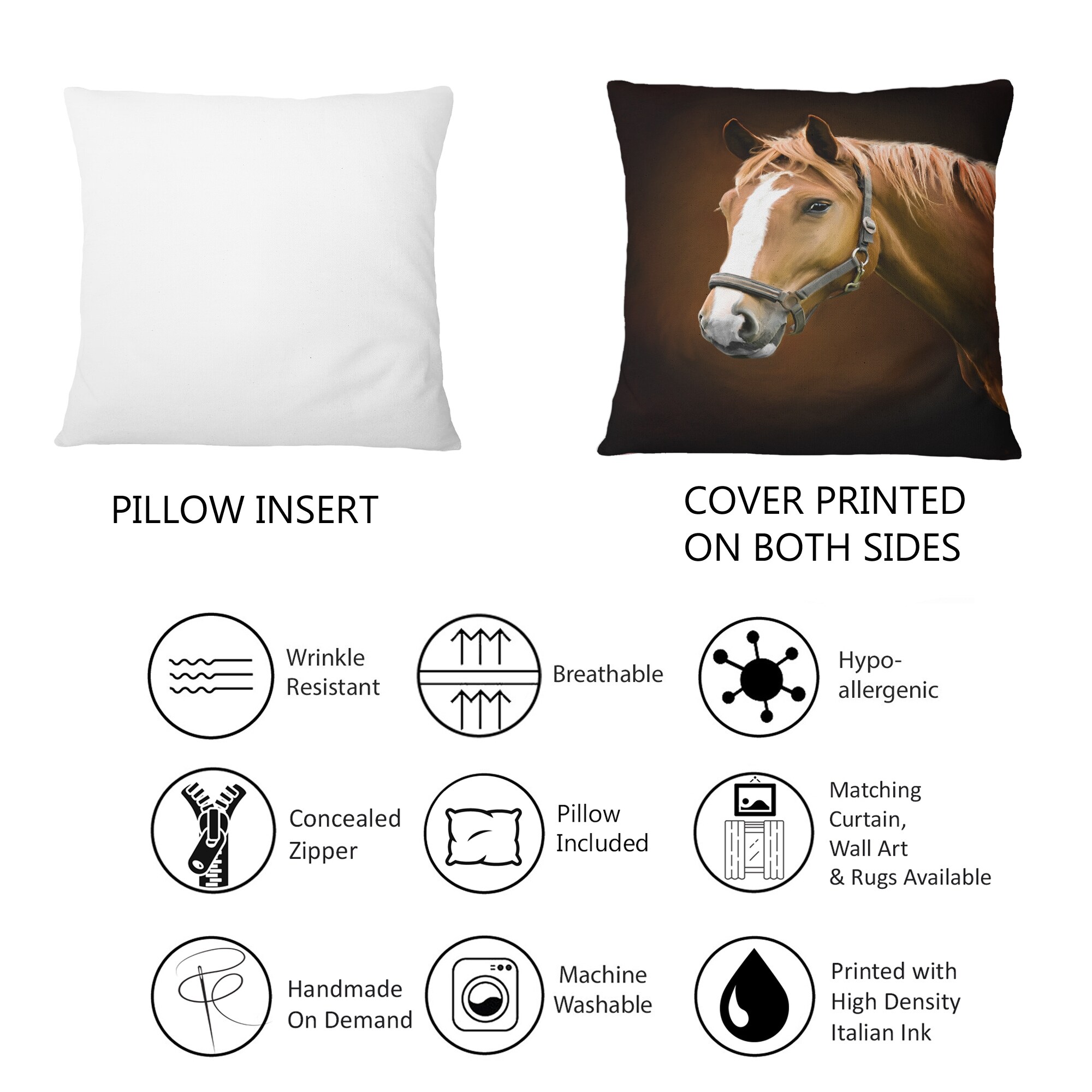 Decorative Throw Pillows for Couch Bed Sofa with Zip CoversAn easy, fun way to add a pop of color or bring new life to any room in your home or office is with these beautiful Farmhouse throw pillows. Dress up your bed, sofa or lounger with this decorative design art pillows. Perfect as Farmhouse bedroom decor, lounge decor Country living room decor. It adds a fun accent to any room. Throw pillows really do work wonders: they can transform any room from uninviting discomfort to warm and welcoming. And they really do go almost anywhere - arrange a couple on the couch or sofa, place one in your overstuffed chair for extra coziness, toss a couple on the bed and prop yourself up for a great read. These Animals pillow is printed using High Color Density Italian inks to create a vibrantly Free Shipping Over $49.99* Details Designart 'Portrait Of Brown Horse With White Nose I' Farmhouse Printed Throw Product Description: Decorative Throw Pillows for Couch Bed Sofa with Zip Covers An easy, fun way to add a pop of color or bring new life to any room in your home or office is with these beautiful Farmhouse throw pillows. Dress up your bed, sofa or lounger with this decorative design art pillows. Perfect as Farmhouse bedroom decor, lounge decor Country living room decor. It adds a fun accent to any room. Throw pillows really do work wondersthey can transform any room from uninviting discomfort to warm and welcoming. And they really do go almost anywhere - arrange a couple on the couch or sofa, place one in your overstuffed chair for extra coziness, toss a couple on the bed and prop yourself up for a great read. These Animals pillow is printed using High Color Density Italian inks to create a vibrantly colored, sharp artwork. Features: - Perfect accent to any furniture piece - Basic shapes with a modern graphic design twist - Printed on 100% light weight polyester - Cushion filled with 100% polyester fill - Wrinkle resistant fabric - Zip Closure so you can remove the pillow from its' cover - Down-like comfort - Odorless - 100% Hypoallergenic - Machine Wash Cold Separately, Gently Cycle Only, No bleach, hang to dry - Print on Demand with High Density Italian Ink - Available in Several sizes - Attribute :Farmhouse - Subject Animals, Country Charm,