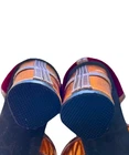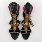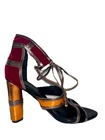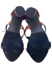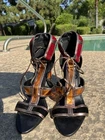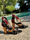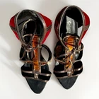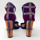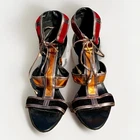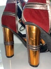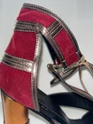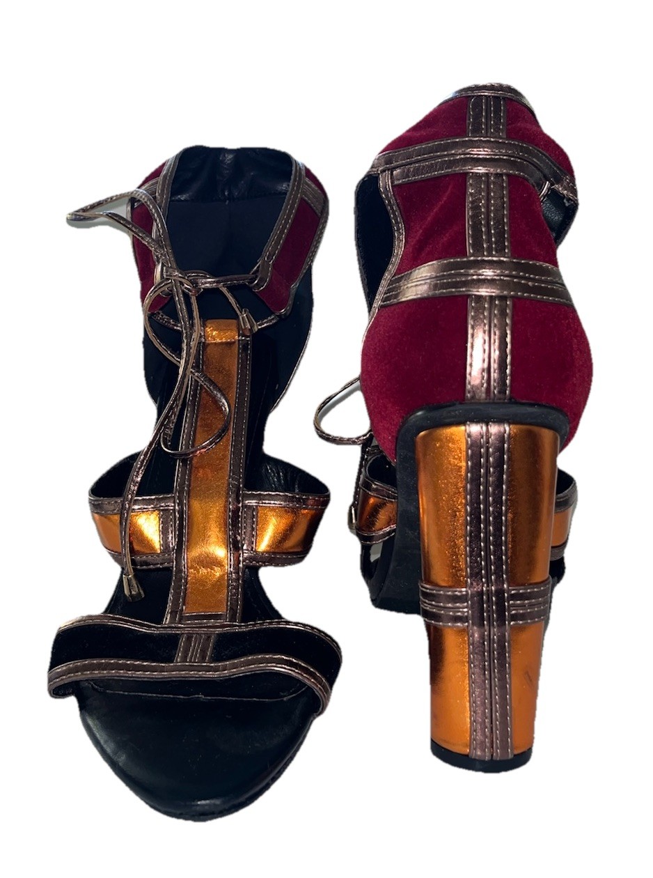 These Patchwork Cage Sandals by Catherine Malandrino are a stylish and bold choice for any occasion. The metallic velvet strappy heels feature a lace-up closure and a block heel design, perfect for adding a touch of glamour to your outfit. With a platform height of 4 inches and an ultra-high heel, these sandals are sure to make a statement. Made from faux leather and velvet materials, these vegan heels are adjustable for the perfect fit and are inspired by the fashion of Kloe Kardashian and Tom Ford. Ideal for weddings, parties, or casual and formal events in the winter and fall seasons. These shoes in near excellent condition. Maybe worn once or twice. Enjoy this luxury look at a fraction of the price.