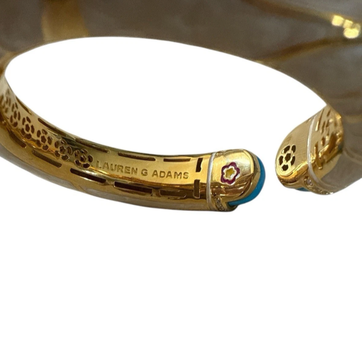 Add a touch of elegance to your wrist with this stunning bracelet from Lauren G. Adams. features a beautiful turquoise glossy enamel design with Swarovski rhinestones. Has a hinged closure for easy wear. This bracelet is perfect for any woman who loves a classic look with a modern twist. The bracelet is signed and comes in a beautiful gold color, making it the perfect gift for any occasion. The cuff is made of high-quality materials and is sure to last for years to come. Don't miss out on the chance to add this beautiful bracelet to your collection.