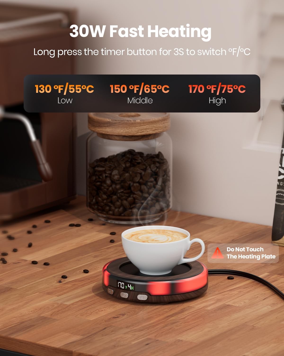 Coffee Mug Warmer for Desk with Colorful Atmosphere lights No more cold coffee in winter with the coffee warmer for desk, you can enjoy the warm coffee or milk in office or home in cold winter Weight: 0.81 LB Parameter: 120V; 30W Cord Length: 4.9 Feet 3 Temperature Setting: 170°F/150°F/130°F Safety Features: Default 4 Hrs shutdown 2-9 Hrs Timed Setting: 2, 3, 4, 6, 8, 9 Hrs timed options Colorful LED Lights: Purple, green, blue, white, red 3 Atmosphere Lights Modes: Multi color breath gradient light, monochrome breath light, monochrome constant light Easy to Clean: Metal waterproof panel, very easy to clean, just wipe the surface with a soft cloth Fit Most Cups: We recommend using a flat bottomed cup, ceramic cups, glass cups, stainless steel cups, feeding bottle, mugs Heat Various Beverages: keep your coffee, tea, milk, cocoa, chocolate, hot on cold winter, coffee warmer for desk, warm at office and home Best gift for friends and family: Nice chooice for coffee lovers, a must have coffee essentials, coffee gift on winter, perfect Christmas gift, New Year gift, Thanksgiving gift, birthday gift for friends, family and lover 3 Temperature Settings: The 30 W coffer cup warmer with faster heating speed, one button easy to adjust the 3 temperature, 130 ℉,150 ℉,170 ℉, keep your coffee at a constant temperature; The LED digital display show the temperature and timed Romantic Atmosphere Lights: Tea warmer with 3 lighting modes and 5 colors, multi color breath gradient light, monochrome breath light, monochrome constant light; Long press for 3 S to turn the lights, mug heater creates a romantic atmosphere in your home 2 to 9 Hrs Auto Shut Off: The coffee heater has 6 options for timed shutdown, click the timer button to set it to auto shut down after 2, 3, 4, 6, 8, 9 Hrs; The cup warmer will automatically shut down after 4 Hrs by default, very safety and convenience Suitable for Different Mugs: This tea warmer is work best for flat bottomed cups, glass cups, ceramic mugs, stainless steel cups, using the lid can maintain heat; The coffee warmer plate can also heating beverages, tea, milk, cocoa, chocolate, candle warmer Perfect Winter Gift: Our Smart Cup Warmer has a beautiful and practical appearance, warming your stomach in cold winter; Coffee accessories for coffee lovers, coffee warmer plate is a perfect gift for men, women, family, friends, on Christmas, New Year