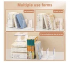 Desktop File Folder Organizer Desk File Sorter Vertical 4 Section Book Holder Product Description Desktop File Folder Organizer Desk File Sorter Vertical 4 Section Plastic Book Holder Adjustable Shelf Dividers Closet Purse Handbag Mail Binder Organizer Magazine Rack Stand Bookshelf Description: Stay organized: Our bookshelf design has 4 compartments for easy sorting and storage of your cluttered books, keeping the desktop tidy and allowing you to easily organize and search for books. Open design makes it easy to access the books you want, with no restrictions on book size. Save desktop space and keep your books organized. Durable materials and sturdy structure: The bookshelf is made of thickened PS material, which is sturdy, durable, impact resistant, and can be used for a long time. Smooth surface, without sharp edges or rough burrs, will not harm your hands. The structure is sturdy and stable, and the heighten and widened baffle keeps the book upright without falling down. Large capacity bookshelf: Dimensions: LxWxH: 32cm x 14.4cm x 13.2cm/12.6in x 5.7in x 5.2in. Ideal for organizing your books, textbooks, documents, magazines, exercise books, notebooks, and more. The anti slip bottom ensures that it will not move. Integrated design, no need installation. Creative design: The bookshelf adopts a fresh color scheme, with an elegant and simple appearance, adding vitality to your desktop. Hollow out design, ventilated and moisture-proof, easy to clean. The hollowed out side panels are convenient for movement and carrying. Multi functional: In addition to being used as a desktop book organizer, our bookshelf can also be used as a toy display rack, snack rack, clothing storage rack and more. It is flexible to use and can be placed horizontally or vertically as needed. The compact size is perfect for your study, living room, coffee shop, office, desk, and more. Type: 4 Compartment Bookends Material: PS Color: Transparent/White/Green/Purple/Pink Size: 260mm x 120mm x 105mm 320mm x 144mm x 132mm 340mm x 143mm x 133mm Package list: 1x Bookend Payment Payment