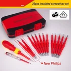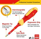 Destornilladores Aislados 1000V Herramientas Para Electricistas Electricidad Set Juego de destornilladores 29 en 1: Incluye caja de almacenamiento y 14 hojas intercambiables: 4 cuadradas, 5 ranuradas, 5 Phillips, 5 Torx, 2 en forma de U, 2 triangulares, 2 tipo Y, 3 hexagonales, 1 comprobador de voltaje y 1 mango extraíble. Certificado de seguridad: El material aislante y el estándar de aislamiento de 1000 V han sido certificados por VDE y GS. Destornilladores aislados que garantizan su seguridad. Juego de destornilladores magnéticos: Todas las puntas de los destornilladores están hechas de acero al cromo vanadio y tratadas magnéticamente para lograr una mayor dureza y un magnetismo más fuerte, adecuadas para trabajos de electricistas profesionales y proyectos de bricolaje en el hogar. Cómodo de usar: El mango ergonómico lo hace más cómodo durante un uso prolongado. Los destornilladores se insertan con precisión en la ranura del mango, sin preocuparse de que la hoja se afloje o se caiga, lo que aumenta la seguridad durante el uso. Ampliamente utilizado: Ya sea que trabaje en campos eléctricos, el automóvil, el barco o en proyectos domésticos, este juego de destornilladores aislados le ofrecerá la precisión que necesita. El mejor regalo para esposos, padres, artesanos y metalúrgicos.