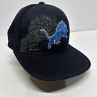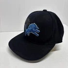 This is a Reebok Detroit Lions hat in size small. The hat is black with a blue lion logo. It is a stretch fit style, perfect for fans of the National Football League team.
