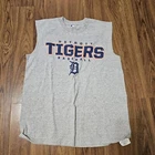 This sleeveless muscle shirt features a graphic print of the Detroit Tigers baseball team in gray. Made of polyester and cotton, it has a crew neck and is machine washable. The shirt is designed for men in size XL with a regular fit. The brand is VF Imagewear, and it is suitable for all seasons, showcasing a colorful theme.