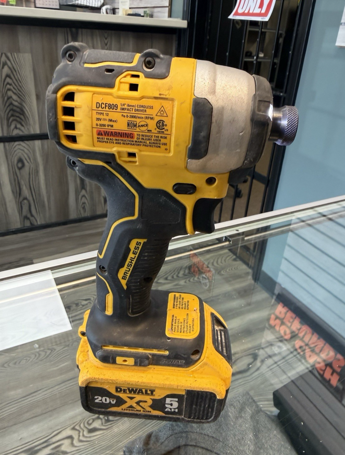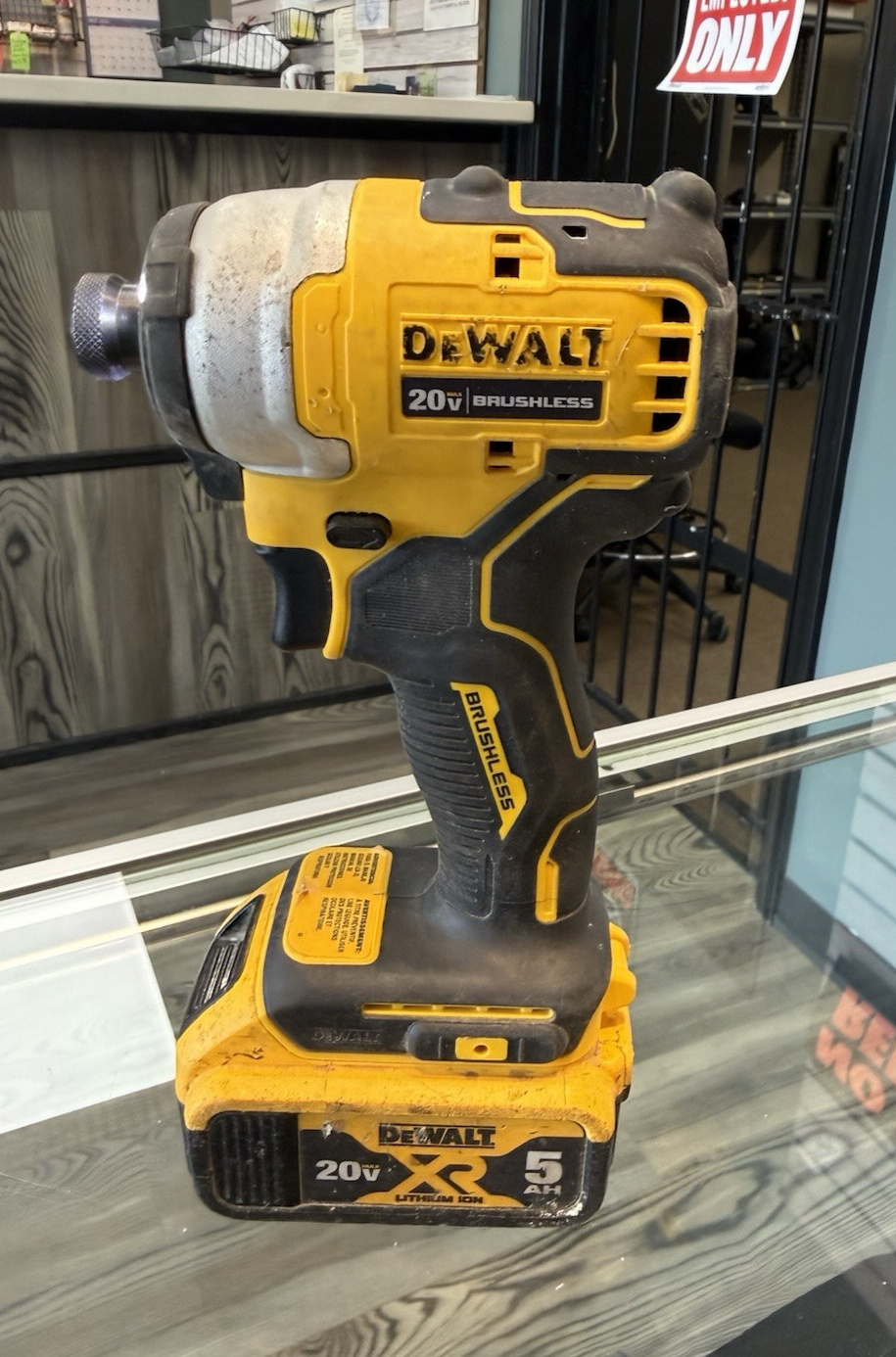 5 Piece Dewalt Tool Set With 3 Batteries, Charger, and Bag DCF809- Atomic 1/4" Impact Driver, Brushless- Good Condition with normal signs of use/wear, including peeling label, shown in photos. Tested, Works Great DCD794- Atomic 1/2" Drill Driver, Brushless- Fair Condition, Definite signs of use/wear, including scuffs/scrapes to chuck, Shown in photos. Tested, Works Great DCL040- LED Work Light, Great Condition with minimal signs of use/wear, including scratches to light cover, does not affect function. Tested, Works Great DCS369- Atomic Reciprocating Saw, Brushless- Good Condition, Definite Signs of use/wear, including scuffs to shoe, shown in photos. Tested, Works Great. DCS565- 6.5" Sidewinder Style Circular Saw, Brushless. Great Condition with normal signs of use/wear. Tested, Works Great. DCB1104- 4 Amp Battery Charger- Great Condition with minimal signs of use/wear. Tested, Works DCB2108- 8AH Battery, 20V MAX XR PowerPack, Great Condition with normal sign of use/wear. Tested and works. DCB205- 5AH Battery, 20V MAX Premium, Fair Condition with definite signs of use/wear, shown in photos. Tested, Works DCB203- 2AH Battery, 20V MAX. Good Condition with minimal signs of use/wear. Tested, works Also included, Large Dewalt tool bag, Good Condition with definite signs of use/wear, shoulder strap pad is torn, shown in photos. Bag is sturdy and fully functional.