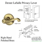 Schlage Dexter LaSalle residential/builder grade privacy lever. J40-LAS-605R This item is Discontinued and is limited to existing inventory. Finish: Polished Brass 605 Function: Privacy; for use on RH bedroom, bathroom, exterior, entry, garage, patio, and storage room doors. Applications: Residential single and multi family doors Certifications: ANSI A156.2, 1996 Series 4000 Grade 3 U.L. Listed: Box pack available Door thickness range: 1-3/8 inch to 1-3/4 inch standard Backset: Universal - fits either 2-3/8 inch or 2-3/4 inch backset ADA compliant: Yes Handed: Yes - Specified as RH or LH The LaSalle curved lever design provides a classic and elegant styling that complements any home's d̩cor. The design can be matched with LaSalle products or other Dexter designs to provide styling suitable for single-family and multi-family applications. They are easy to install. Priced and sold each.