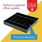 Dial Industries Expandable Office Drawer Desk Organizer Storage Tray Black Product Details Specific Uses For Product: Stationery Material: Plastic Special Feature: Durable Color: Black Brand: Dial Industries, Inc. Finish Type: Finished Product Dimensions: 9.5"D x 18"W x 2.25"H Capacity: 1 Liters Package Type: Standard Packaging Number of Items: 1 Manufacturer: Dial Industries Inc. Part Number: 02564 Item Weight: 1.3 pounds Country of Origin: USA Item model number: 02564 Is Discontinued By Manufacturer: No Style: Office Finish: Finished Item Package Quantity: 1 Number Of Pieces: 1 Special Features: Durable Included Components: Dial Industries Expand-A-Drawer Desk Organizer Tray Batteries Included?: No Batteries Required?: No Specific Uses For Product: Stationery Material: Plastic Special Feature: Durable Color: Black Brand: Dial Industries, Inc. Finish Type: Finished Product Dimensions: 9.5"D x 18"W x 2.25"H Capacity: 1 Liters Package Type: Standard Packaging Number of Items: 1 Mounting TypeItem Weight: flange mounting1.3 Pounds Number of CompartmentsUnit Count: 91.0 Count Perfect to organize pens, clips and other office supplies; Made in USA Will fit most desk drawers; expands from 9" to 18" wide; 16" long and 2.25" high for more organization 9 compartments to hold everything from pens, scissors, odds-and-ends; find supplies easily Made of durable plastic material; easy to clean