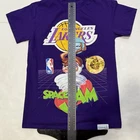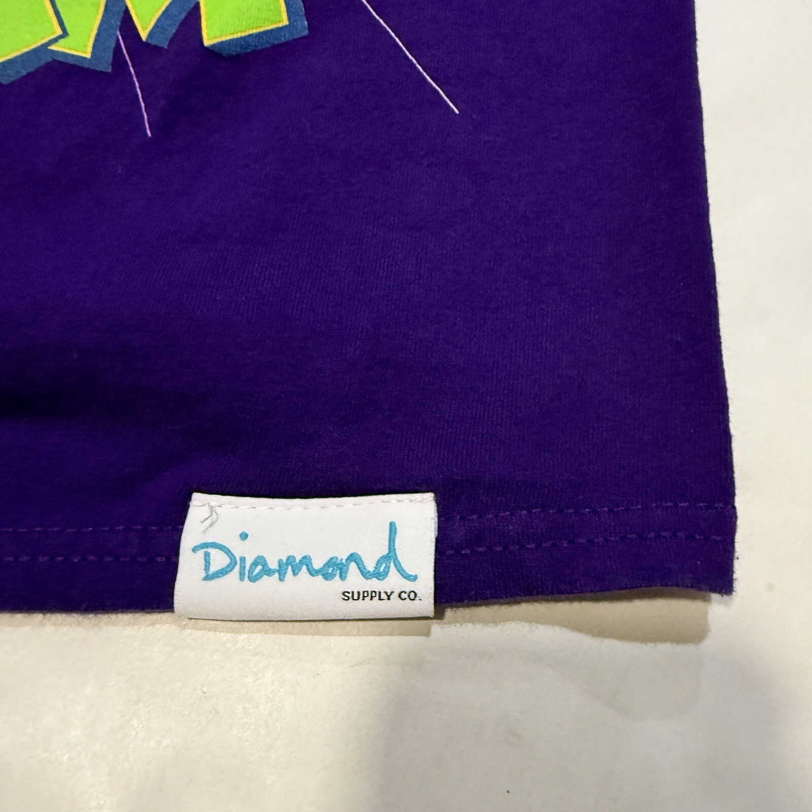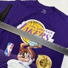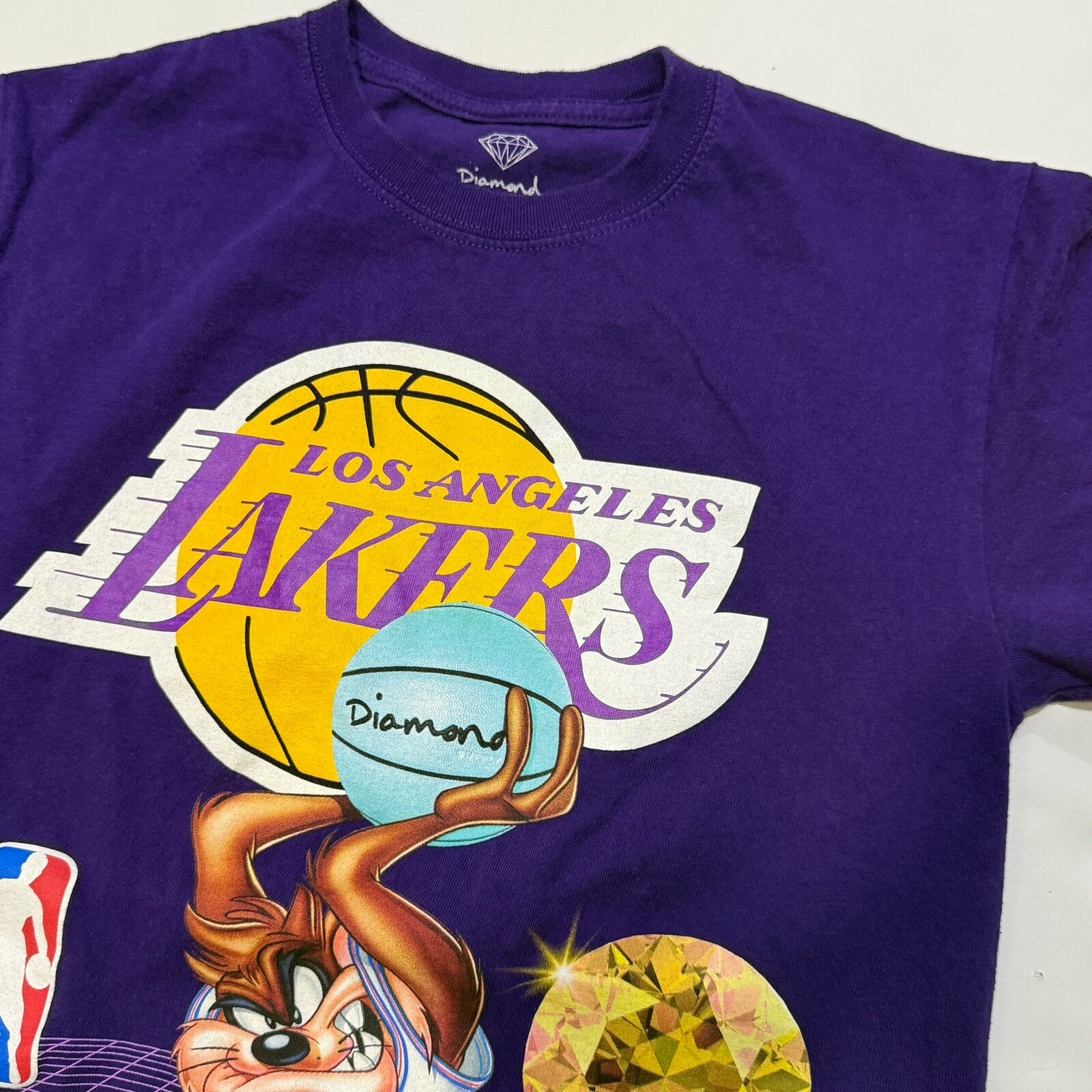 The product is a small size T-shirt featuring a collaboration between Diamond Supply Co. and the Los Angeles Lakers, inspired by the iconic Space Jam movie. The shirt is designed with short sleeves, a crew neck, and made of cotton material. It showcases the character Taz from Looney Tunes in a purple color scheme, fitting the cartoon and classic theme. Machine washable and in regular fit, this T-shirt is perfect for fans of basketball and pop culture references.