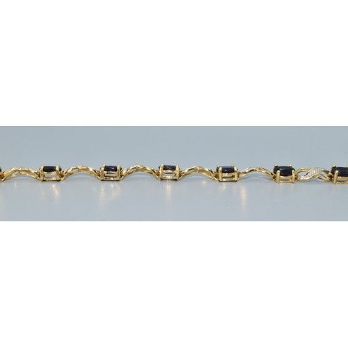 Gold marked 375 and 9ct, Sapphire and Diamond ladies bracelet in the classic style of box Sapphire and twist Diamond dividers with lobster claw catch 20cm long hallmarked as Diamond, the sapphire measure 8mmx4mm, the Diamonds are set in a cross over pattern the bracelet is 5mm deep and the Sapphires are held in a claw design with a good weight will be a pleasure to wear 7.0grams (ALKS 137)