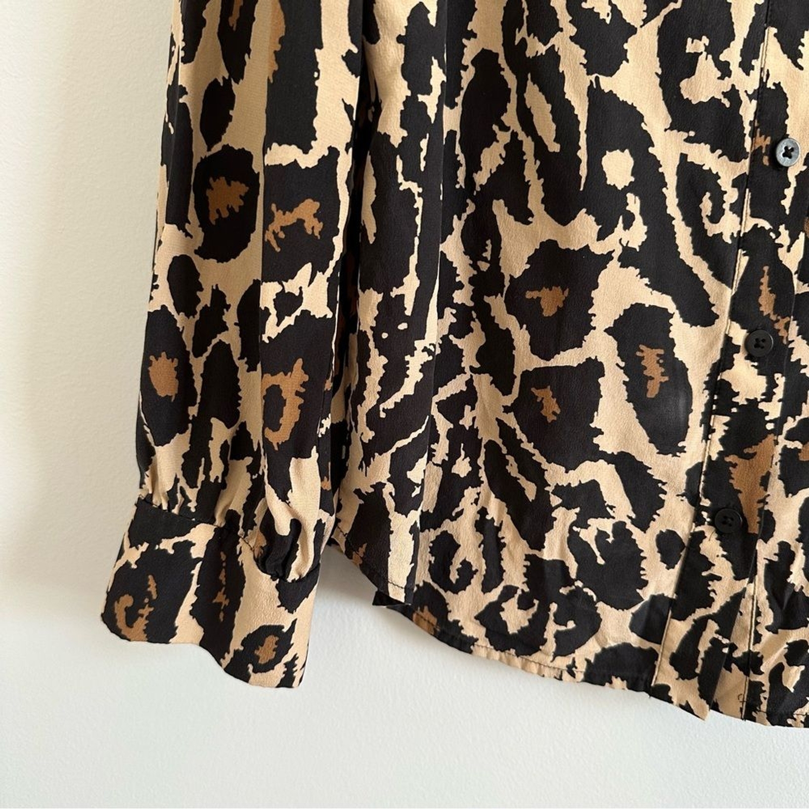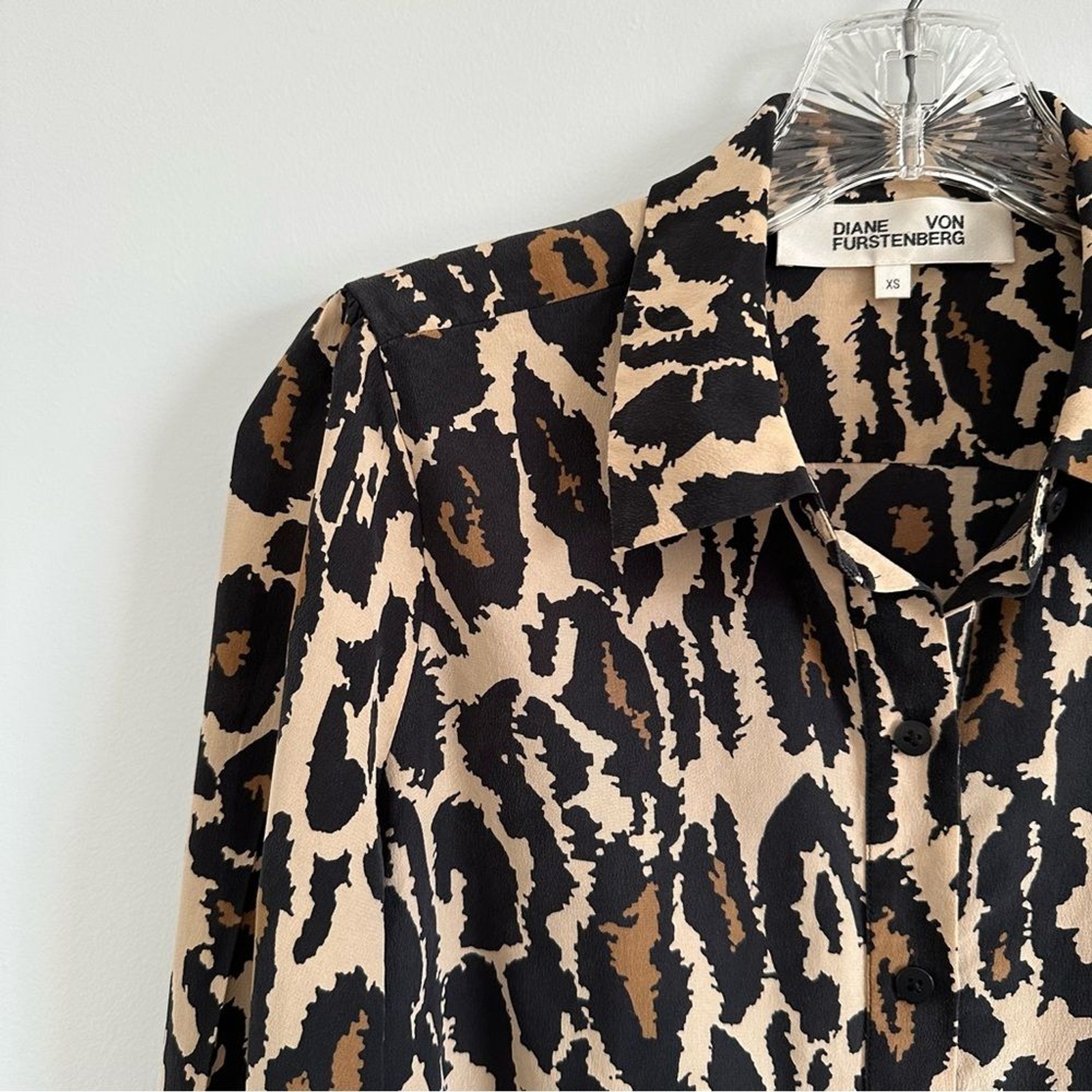 DVF Diane Von Furstenberg Animal Print Blouse Mariah Printed Silk Button Down Top Cheetah leopard print 100% silk Mariah Printed Button Down Excellent condition Size XS Retails: $300 Gorgeous silk blouse! Excellent to dress up or wear to the office like in the last few stock photos. Pit to pit lying flat: 18 inches Shoulder to hem: 24 inches