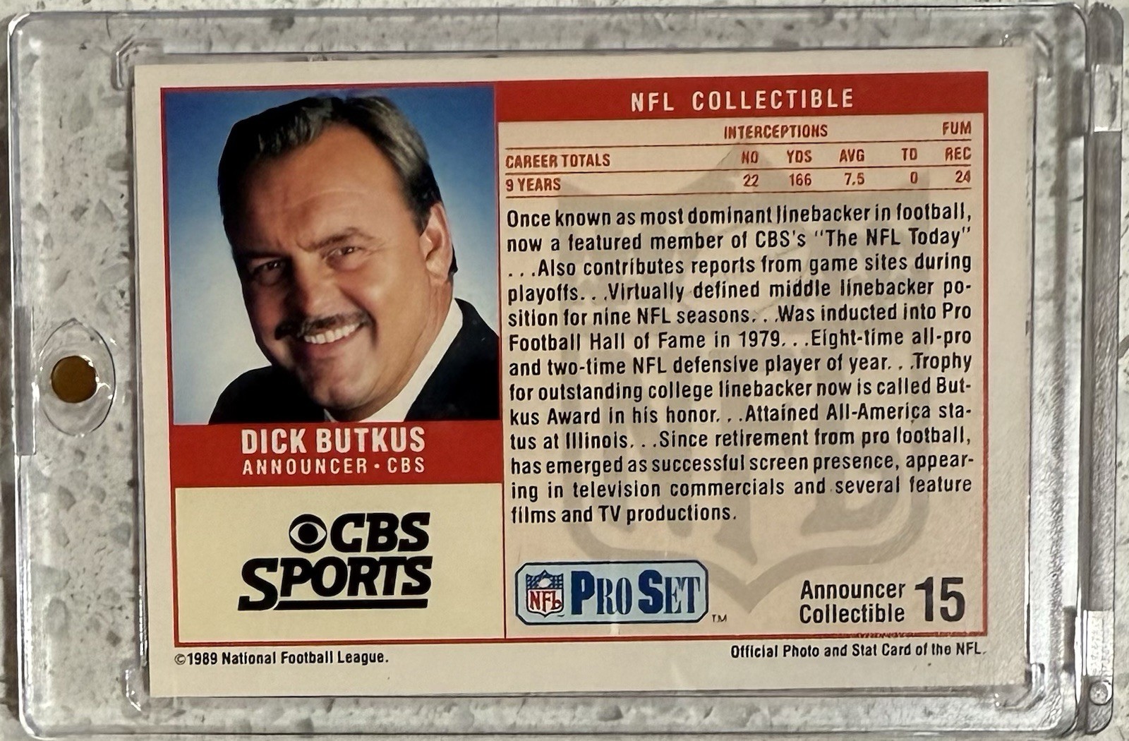The Dick Butkus autographed Pro Set NFL collectible trading card is a must-have for any Chicago Bears or football enthusiast. This hard-signed card from 1989 features the iconic player on card stock material, making it a valuable addition to any sports memorabilia collection. With a focus on the National Football League (NFL) and CBS Sports Announcer career, this original card represents a piece of football history for fans to cherish.