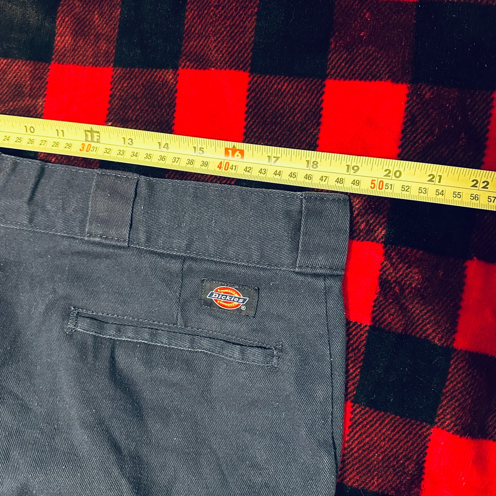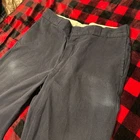 The product is a pair of Dickies Chinos for men in size 38x33 in a dark navy blue color. These work pants are made of cotton with a mid-rise and a flat front design. They feature a hook & loop closure, slash pockets, and a straight leg style. The pants are machine washable and suitable for all seasons, making them ideal for a variety of workwear occasions. The Dickies 874 model is known for its durability and versatile style, fitting for various themes like workwear, grunge, and retro aesthetics. Obvious fading and distressing from working men. 38 inch waist 33 inch length