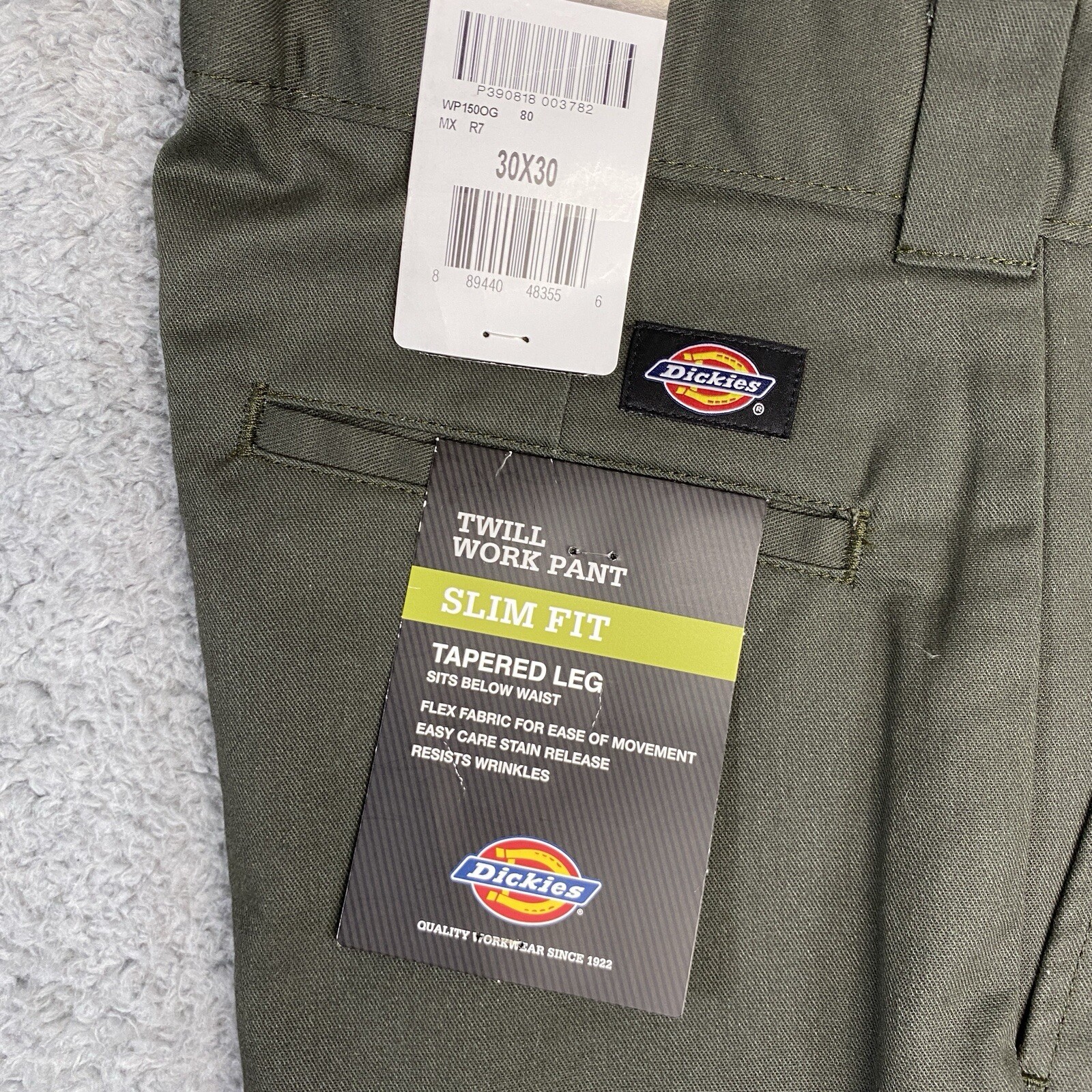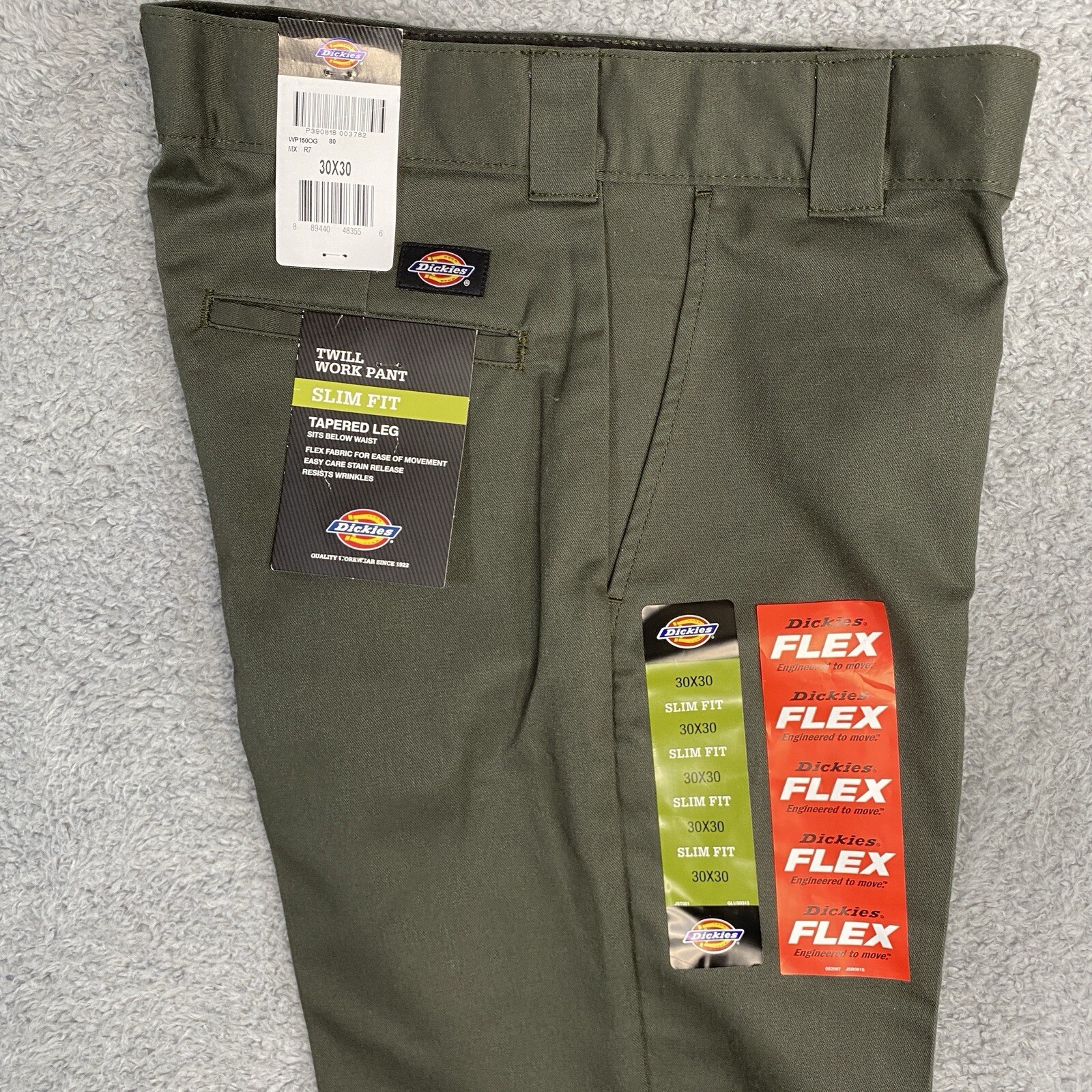New with tags. Dark green. Machine washable. From tag: Tapered leg, Sits below the waist, Flex fabric for ease of movement, Easy care stain release, Resists wrinkles. Waist:30", Rise:11", Inseam:30", Ankle width:7". Ships by USPS Ground Advantage. Dickies Mens 30x30 Work Pants Green Slim Fit Tapered Leg Flex Twill Slacks New with tags. Dark green. Machine washable. From tag: -Tapered leg -Sits below the waist -Flex fabric for ease of movement -Easy care stain release -Resists wrinkles Waist:30" Rise:11" Inseam:30" Ankle width:7" Ships by USPS Ground Advantage.