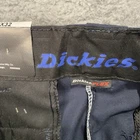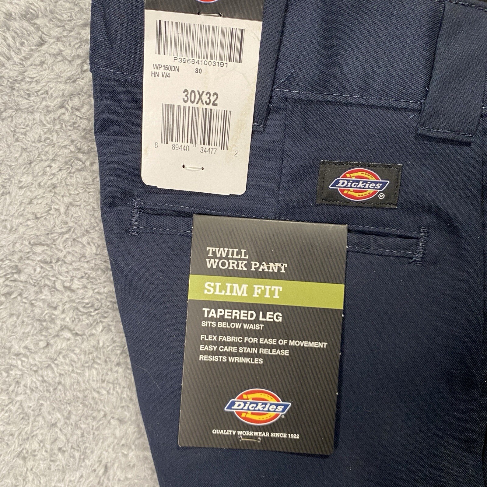 Dickies Work Pants Mens 30x32 Flex Slim Fit Tapered Leg Navy Blue Actual 30x31 New with tags. These twill work pants are slim fit with tapered leg. The label states "Sits Below Waist". The measured inseam of 31" may fit slightly longer. Waist: 30" Rise: 10" Across thigh: 11" Inseam: 31" Ankle Width: 7" Ships by USPS Ground Advantage.