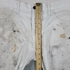 The product is a pair of Dickies Men's Pants in size 32x31, designed for utility, carpentry, or painter work. These white pants feature a mid-rise and straight leg style, with a comfortable cotton denim fabric and easy care properties. The pants have a zipper and button closure, along with various pockets for convenience. The logo and theme of the Dickies Sherwin Williams product line add a touch of grunge and art to the overall design, making them suitable for casual or workwear occasions in any season.