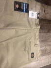 Elevate your workwear with these brown Dickies khaki pants. Designed with a relaxed fit and straight leg, these pants provide comfort and style for any job. Made from a polyester blend, these pants are machine washable and feature pockets for convenience. The mid-rise and flat front create a classic look, while the TMMK logo on the back adds a personalized touch. These pants are perfect for any season, whether you're working indoors or outdoors. Ideal for men in the trades, these pants are made to last with durable materials and quality construction. The pants also come in a size 38 with a 35 inch inseam and a 10 inch leg opening. Don't miss out on this work essential, get your hands on these Dickies pants today!