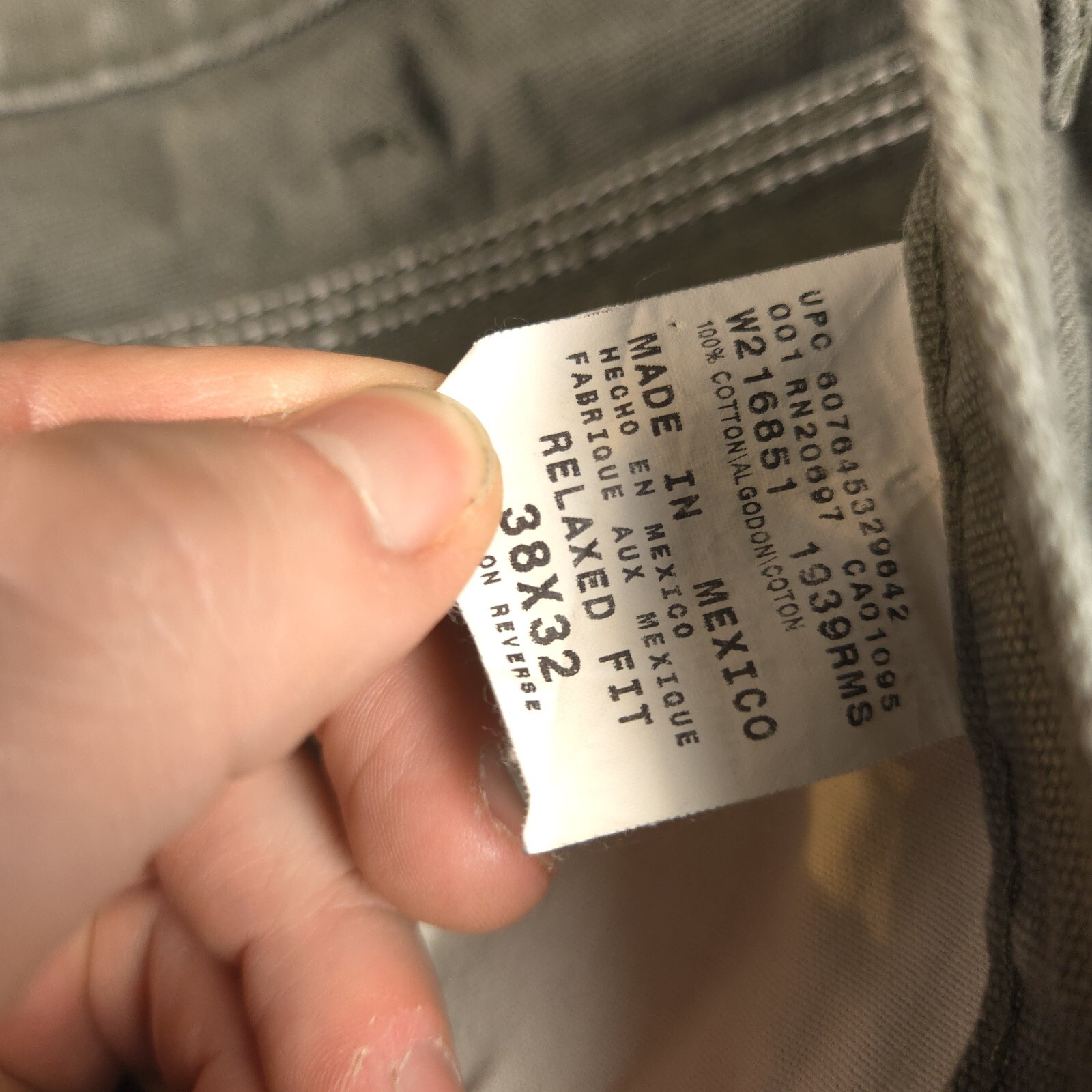 Tagged size 38x32 see photos for measurements to determine proper fit before buying. Thanks. Has small stain shown in pic 4.