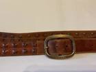 Elevate your style game with this stunning brown leather belt from Diesel, made in Italy. The belt boasts a studded design, with brass hardware accents that add a touch of sophistication to any outfit. The leather cover pyramid studs are a unique touch that sets this belt apart, making it a must-have for any fashion-conscious man. The high-quality leather material ensures durability and longevity, while the Italian-made belt guarantees designer-quality. Add this beautiful belt to your collection today and take your style to the next level. THIS BELT CAN BE UNISEX TAG - 38” 1 1/2” WIDE SOFT QUALITY MADE LEATHER BRASS? BUCKEL. SMOKE FREE HOME PLEASE FEEL FREE TO ASK QUESTIONS. VIEW ALL OF THE PICTURES FOR A BETTER VISUAL DESCRIPTION