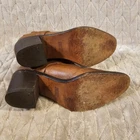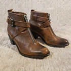 High quality pair of leather boots. Has an adjustable belt and zipper closure. Has a 2.5 inch heel. The leather is super soft. There's some discoloration and scuffs to the leather as shown in the photos, not sure if it is stock or not. See photos for full details.