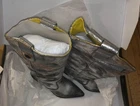 Step out in style with these brand new metallic silver cowboy boots from Cowboy. Made with laminated leather, these boots are perfect for any occasion. The boots are size 7 and are sure to make a statement with their eye-catching design. Whether you're dressing up for a night out or looking for a unique addition to your everyday wardrobe, these boots are the perfect choice. They are new without a box. Order now and add a touch of glamour to your shoe collection with these stunning Cowboy boots.
