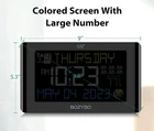 Digital Clock with 6 Alarm Clocks: Atomic Clock with Indoor Temperature Self Time Correction Clock with Day and Date for Elderly Adjustable Brightness Wall Clock or Desk Clock for Bedroom Digital Alarm Clock: Digital clock has 6 alarm clocks to program your day and week. It comes with three stickers to DIY your alarm clocks. Colored digital clock with large numbers to show information including: time, day of the week, date, , indoor temperature, DST, time zone and moon phase. Atomic Clock for Bedrooms with WWVB Function: The atomic clock has four time zones (P: PST, M: MST, C: CST, E: EST) and has the ability to sync to the correct time at night with the atomic WWVB function. With DST ON, the clock will adjust to daylight savings time automatically. After initial setup the clock will automatically sync to the correct time during the night with the WWVB function on. Digital Clock with Large Display: Equipped with " HD colorful screen, you can read the screen from any angle, including on a desk or hanging on a wall. Large display with adjustable backlight will be helpful to read information easily, including different colors for each function. Plugs into a wall outlet and can also be run via battery backup to ensure seamless use during power outages. Easy to Set Digital Calendar: Operation buttons and Snooze function are accessible when clock is freestanding or hanging on a wall. Includes detailed written user manual for ease of setup and use. Includes an indoor temperature reading to help you plan your day and comfort level. Gift Idea: Well packaged digital clock with large display is a great gift for family members, including older adults due to the large, clear display. The clock is well-designed to match any bedroom, living room, office, or home. A great gift for Mother's Day and Father's Day. Enjoy Warm & Easy Lifestyle Be clam and confident to every day, take care your family well.