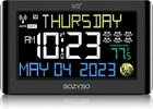 Digital Clock with 6 Alarm Clocks: Atomic Indoor Plug in Black Product Details Brand: BOZYBO Color: Plug in Black Display Type: Digital Style: Modern Special Feature: Snooze, Alarm, Adjustable Brightness Product Dimensions: 8.8"W x 5.1"H Power Source: Battery Powered Age Range (Description): Adult Room Type: Living Room, Bedroom, Classroom, Nursery, Dining Room Shape: Rectangular Digital Alarm Clock: BOZYBO Digital clock has 6 alarm clocks to program your day and week. It comes with three stickers to DIY your alarm clocks. Colored digital clock with large numbers to show information including: time, day of the week, date, year, indoor temperature, DST, time zone and moon phase. Atomic Clock for Bedrooms with WWVB Function: The atomic clock has four time zones (P: PST, M: MST, C: CST, E: EST) and has the ability to sync to the correct time at night with the atomic WWVB function. With DST ON, the clock will adjust to daylight savings time automatically. After initial setup the clock will automatically sync to the correct time during the night with the WWVB function on. Digital Clock with Large Display: Equipped with 7.5" HD colorful screen, you can read the screen from any angle, including on a desk or hanging on a wall. Large display with adjustable backlight will be helpful to read information easily, including different colors for each function. Plugs into a wall outlet and can also be run via battery backup to ensure seamless use during power outages. Easy to Set Digital Calendar: Operation buttons and Snooze function are accessible when clock is freestanding or hanging on a wall. Includes detailed written user manual for ease of setup and use. Includes an indoor temperature reading to help you plan your day and comfort level. Gift Idea: Well packaged digital clock with large display is a great gift for family members, including older adults due to the large, clear display. The clock is well-designed to match any bedroom, living room, office, or home. A great gift for Mother's Day and Father's Day.