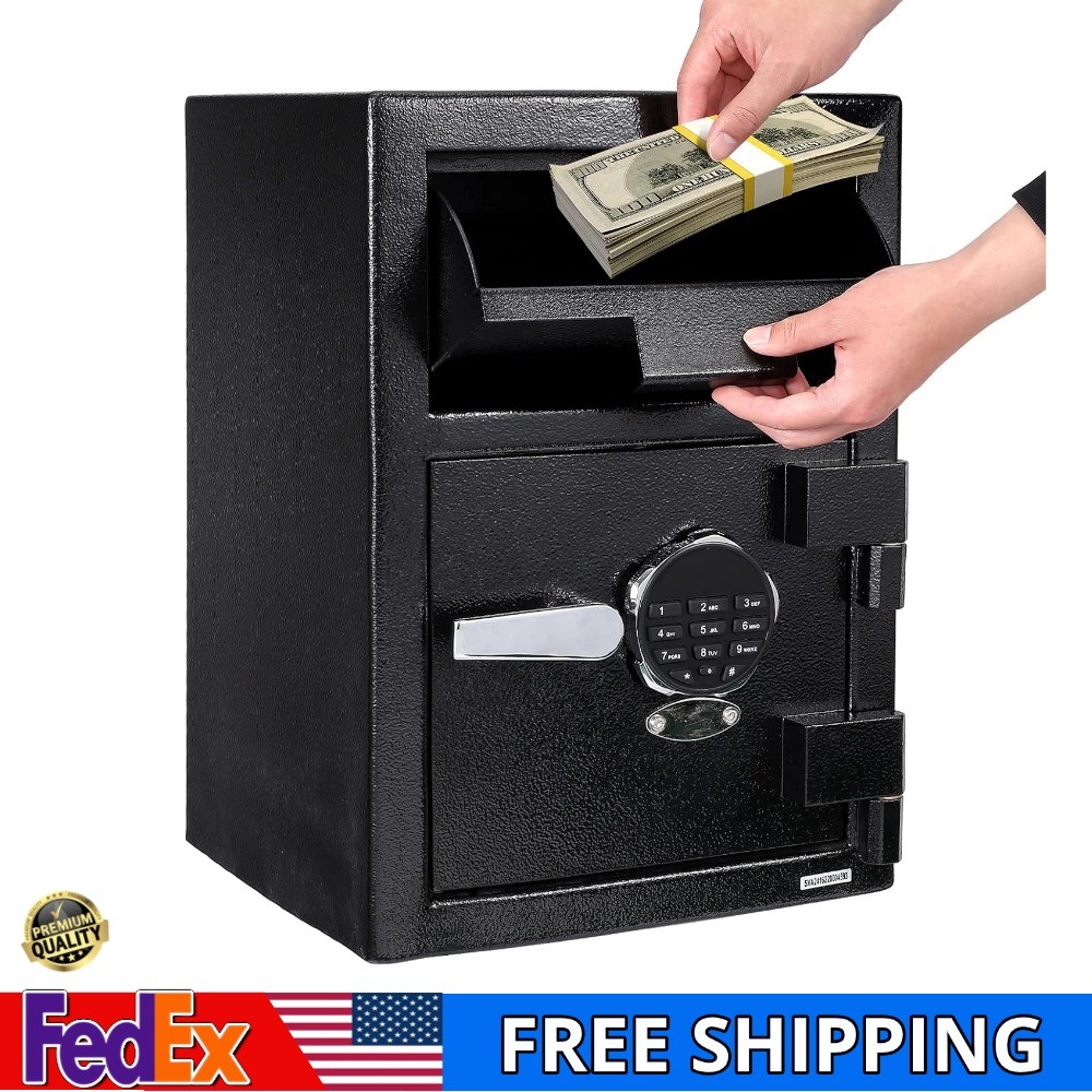 Product description 1.12 Cubic Feet of Storage Space Digital Depository Safe Box Standard Depository Drop Safe with Multi-User Electronic Pin Pad & Keyed Storage Locker Depository Drop Safe with Multi-User Electronic Pin Pad & Independent Electronic Multi-User Storage Locker Theft Protection A series of anti-fishing baffles located on the back of the drop, the chute prevents the contents from being retrieved by an unauthorized user. Easy-to-Program PIN The simple digital keypad design is extremely user-friendly to set up and operate and can store 2 unique PIN codes. Solid-Steel Deadbolts 3 steel deadbolts set in the anti-pry door help ensure that the depository safe door can only be opened when the correct PIN code is inputted. Backup Access A hidden lock allows the safe to be opened with a traditional key in the event that the batteries run low. The large storage area offers you ample space to store almost anything of your choice like gems, jewelry, documents, cash, photos, etc. This drop-box comes to you in classic black color with a textured surface making it look sleek and secure. Great for high-turnover environments with easy user-code re-programming. Safe with Drop Slot Exterior Dimensions: 13.7"*15.7"*19.2" Weight: 81.5 pounds Solid steel body with laser cutting and seamless welding Wear-resistant and corrosion-resistant smooth coating surface Concealed pry-resistant hinges and double-layer steel doors with a smaller gap Pre-drilled holes and hardware for mounting Solid Steel Design 3 Steel Locking Bolts, Reinforced Pry Proof Hinges Hinged Deposit Slot with Anti-Fishing Security Up to 6 User Codes Can Be Stored Time-Delay Function Available Lockout Mode for Wrong Code Entry Anti-Fishing Drop Compartment Mount to Floor or Wall with Included Hardware and Instructions Safes are made using heavy-duty and drill-resistant hardened steel This high-security safe comes with a triple bolt action locking mechanism and, an anti-fishing deposit drawer making it safe against any theft or tampering, making it perfect for homes, businesses, banks, restaurants, retail stores, etc.