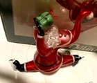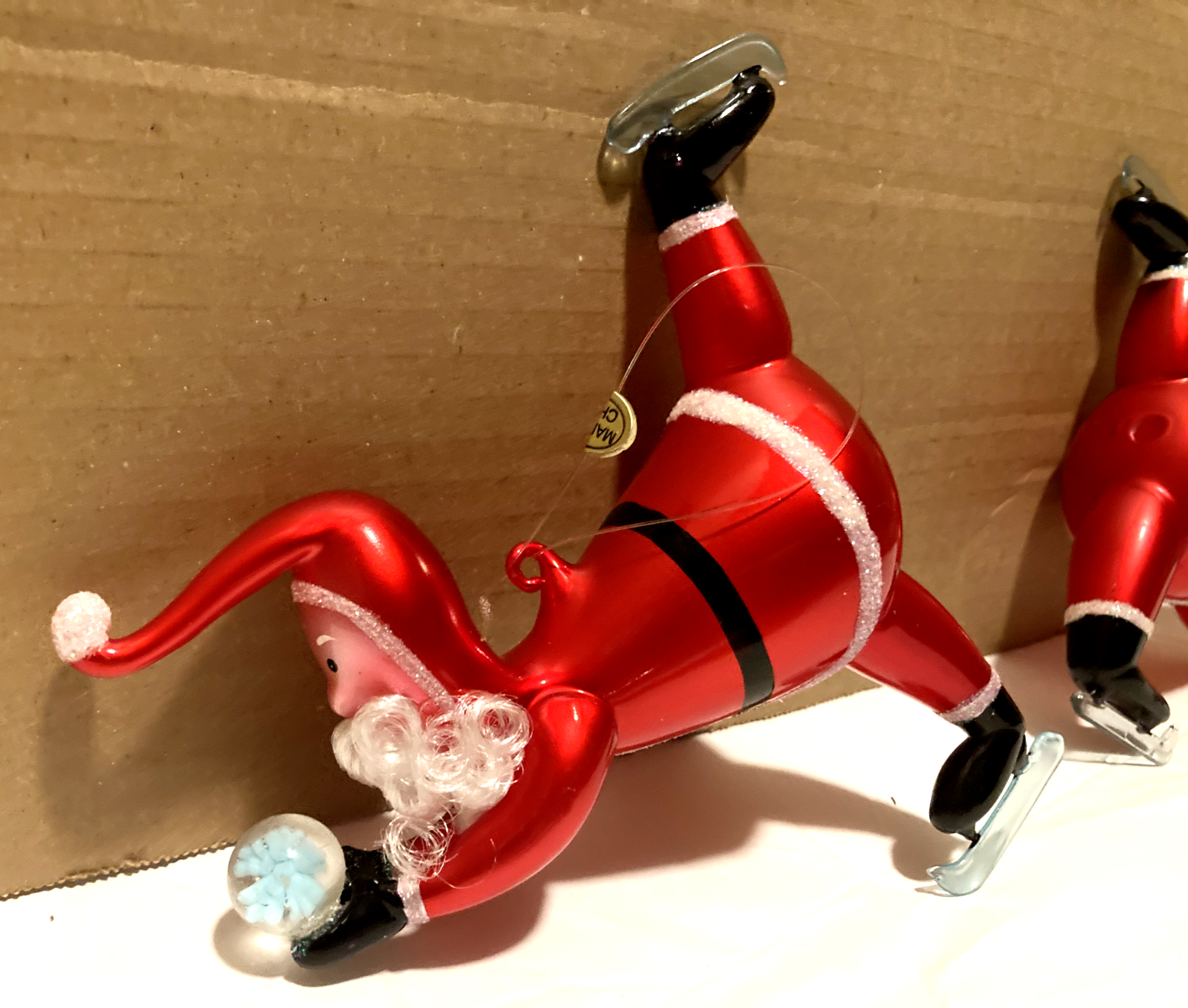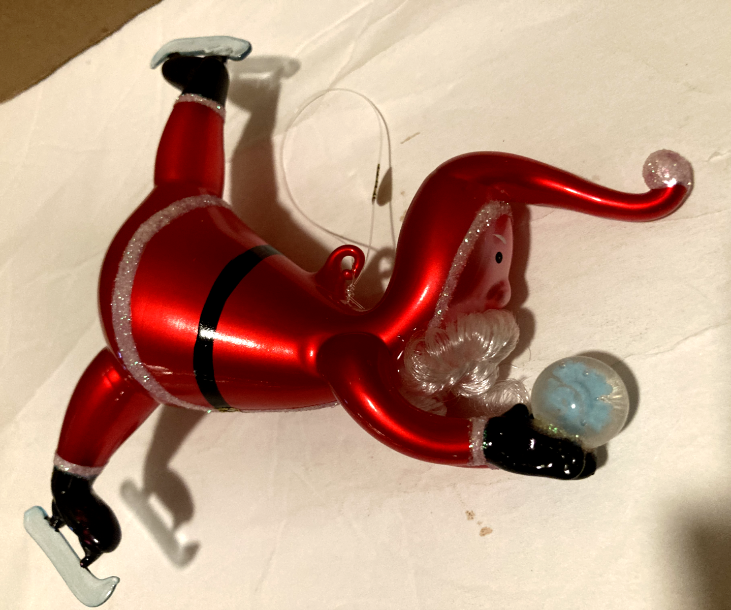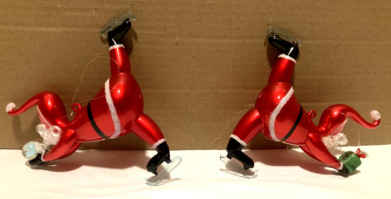 This is a set of 2 Skating Santa Ornaments by Dillard's. They show normal light wear from displaying. The Santas measure approximately 5 inches tall. The box shows wear from storage. Please see pictures for condition..