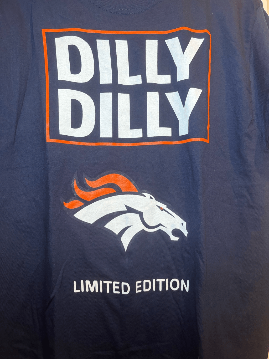 Dilly Dilly Denver Broncos T-shirt size Large Color-Blue New in Bag