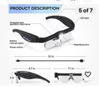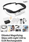 Dilzekui Magnifying Eyeglasses with LED Light ...1.5X to 5.0X Rechargeable w/USB. Includes 4 different lenses magnifications 1.5X, 2.5X, 3.5X, 5.0X , plastic lens case, lens cleaning cloth, usb cord, eyeglass frame and head strap. Shipping to US locations only.