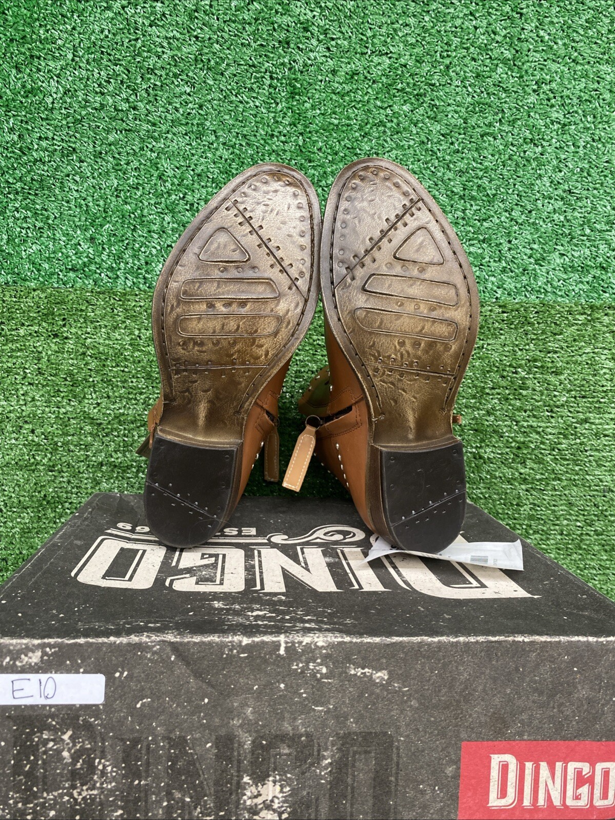 Dingo Women's Size 7.5M Destry Studded Zippered Ankle Leather Booties in Camel color feature a stylish almond toe shape, mid-height block heel, and leather upper with studded accents. These ankle booties are designed for casual occasions, offering a trendy look with a solid pattern. The outsole material is leather, ensuring durability and style in this fashionable pair of booties. Listed by- EH Date- 1/15/24 Condition- NWB Shade/Size- Camel/ 7.5 M SKU- E10