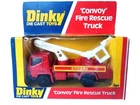 Dinky Convoy Fire Rescue Truck #384 Diecast Model Firetruck Vintage item circa 1970's Factory error - "Rescue" decal is upside down on side of truck Has extremely small amount of feathering/curling at corners and a few rough edges; slight scuffing and denting along with adhesive residue from price tag on plastic Overall great condition with solid box construction, unyellowed and unbroken plastic, bright and vibrant colors, clear and crisp graphics, and mint contents The error makes it a hard to find rarity Will make a great addition to your collection!