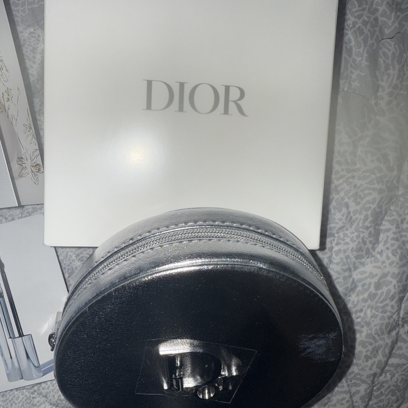 NEW Limited Editon Round Silver Makeup Pouch/Coin Set 2025. Round cosmetics pouch with deluxe samples of Diorshow Maximizer 4D Lash Primer Serum (0.13 oz.), Diorshow Iconic Overcurl Mascara (0.14 oz.), J'adore Eau de Parfum (0.04 oz.)