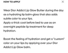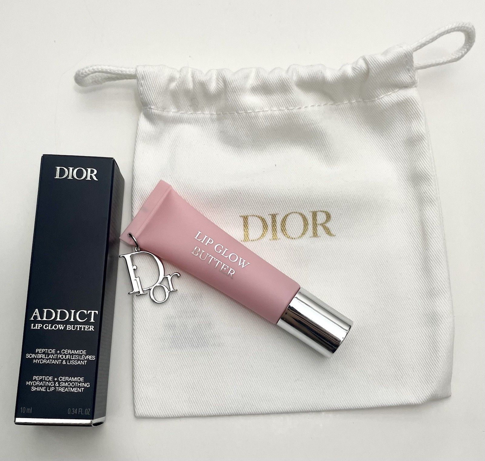 Authentic New 2025 Dior collection Includes original Dior pouch The peptide and ceramide duo supports the skin barrier and helps smooth and protect lips from external stressors. Cherry oil helps maintain hydration and gives a plumping effect. Made with 90% natural-origin ingredients.' HOW TO APPLY Wear Dior Addict Lip Glow Butter during the day as a hydrating lip balm-gloss that also adds subtle color to your lips. Apply a thick coat before bed to use as an overnight peptide lip treatment for deep hydration. Boost the feeling of hydration and get a "custom" color on your lips by applying over your Dior Addict Lip Glow balm Lightly tinted shades with a high shine and non-sticky finish - Gloss-balm hybrid formula that supports the skin barrier and hydrates for 24 hours' - Lips feel ultra-comfortable and soothed for 8 hours? 1 Instrumental test on 30 women. 2 Self-rating test on 30 women.