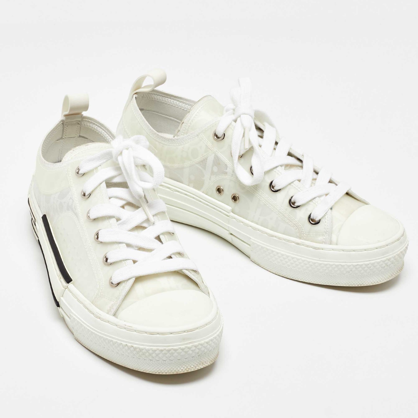 Coming in a classic silhouette, these designer sneakers are a seamless combination of luxury, comfort, and style. These sneakers are finished with signature details and comfortable insoles.Certified by The Luxury Closet - This item has gone through a detailed authentication process overseen by our experts. We offer a lifetime guarantee of authenticity on all our items. Import duties, taxes and charges are not included in the item price. These charges are the buyers responsibility. Please check with your country’s customs office to determine what these additional cost will be prior to buying. Our eBay Store About Us Contact Us Add to Favorite Sellers Dior White Oblique Mesh and Rubber B23 Low Top Sneakers Size 37.5 $687.5 Coming in a classic silhouette, these designer sneakers are a seamless combination of luxury, comfort, and style. These sneakers are finished with signature details and comfortable insoles. Product Details Brand Color White Dimensions Material Mesh, Rubber Size 37.5 Outsole Width 9 cm Outsole Length 26 cm Heel Height Includes Original Box Certified by The Luxury Closet This item has gone through a detailed authentication process overseen by our experts. We offer a lifetime guarantee of authenticity on all our items. How We Check The in-house team of experts at The Luxury Closet is highly trained to verify the authenticity and the condition of the luxury products. They ensure that only 100% authentic items are put on sale.The evaluation process is unique with its own mix of assessment criteria and differs according to the category. Each item is evaluated based on the following combination of hallmarks, hardware, stitching, symmetry, material, craftsmanship, stamping, codes, hologram stickers, and packaging. Our authenticators also check if the items have been modified or amended (e.g., aftermarket diamonds, replaced batteries, repaired bags, etc.) International Buyers Import duties, taxes and charges are not included in the item price. These charges are the buyers responsibility. Please check with your country’s customs office to determine what these additional cost will be prior to buying.