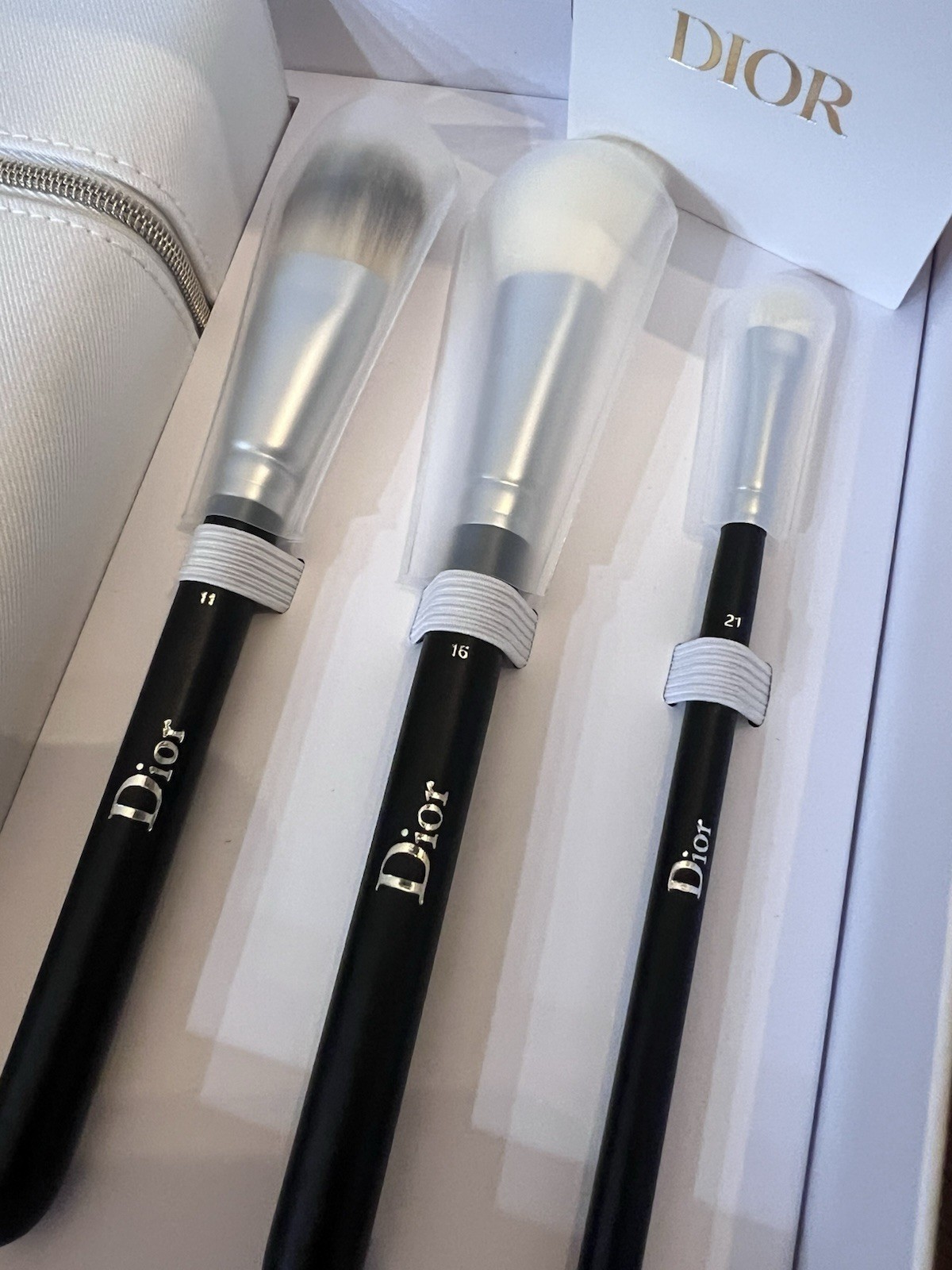 The Dior Backstage 3pc Makeup Brush Set is a luxurious and limited edition collection of makeup brushes, designed in a sleek white rectangular case. Made from high-quality synthetic fibers, these brushes are perfect for achieving a flawless makeup look. This set is part of the Dior Makeup Brushes product line and is a must-have for any makeup enthusiast looking to add a touch of elegance to their routine. The Dior brand ensures both quality and prestige, making this brush set a valuable addition to any collection. Brushes included are a 21 Eyeshadow Shader Brush, an 11 Light Coverage Fluid Foundation Brush, and a 16 Blush Brush.