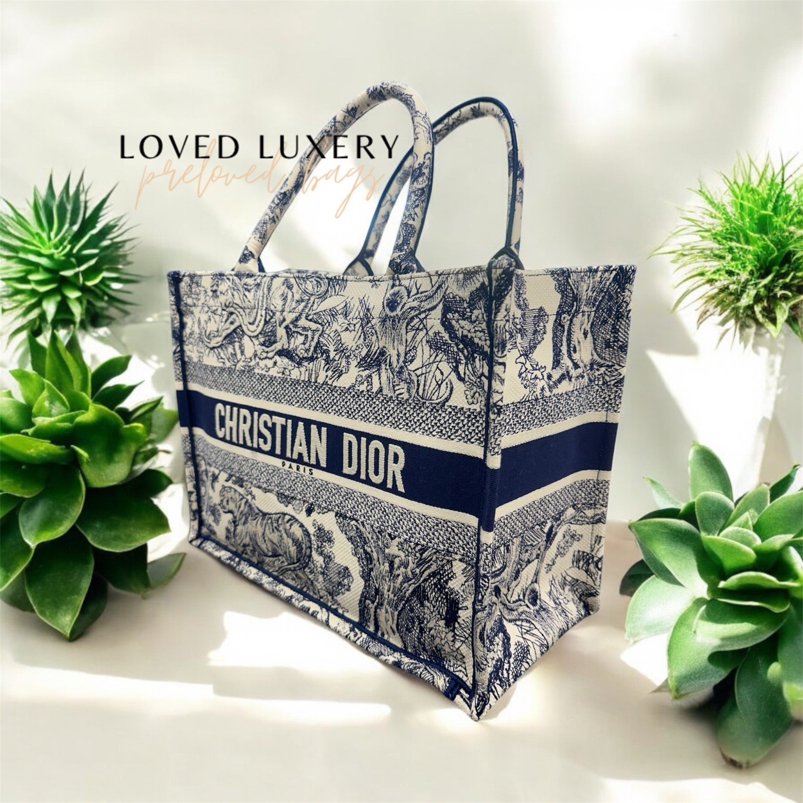 Introduced by Maria Grazia Chiuri, Creative Director of Christian Dior, the Dior Book Tote has become a staple of the Dior aesthetic. Designed to hold all the daily essentials, the style is fully embroidered with the ecru and blue Toile de Jouy motif enhanced by the Christian Dior Paris signature on the front. The medium tote exemplifies the House's signature savoir-faire and may be carried by hand or worn over the shoulder. Christian Dior Paris signature on the front Made in Italy Dimensions: 36 x 27.5 x 16.5 cm / 14 x 11 x 6.5 inches (Length x Height x Width) The bag's large size can accommodate a 15-inch laptop, a pouch, a wallet, a phone, sunglasses and lipstick Handle length: 42 cm / 16.5 inches Handle drop length: 16 cm / 6.5 inches Weight: 600 g / 21 ounces