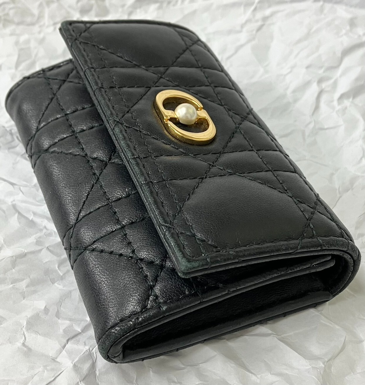 The inside of the bag is relatively clean and has only minor signs of wear and tear, few minor imperfections and little loss of shape. Size:W11xH7.5xD2.5cm 2 card pockets 1 gusset pocket 1 zipper coin purse Color: Black with gold hardware Materials: Leather (Cannage) and resin pearl Attachment: storage bag, box, paper tag, ribbon -------------------- This item has been authenticated as genuine by an authenticity agency. Secondhand dealer license No. 62111R061036 issued by Osaka Prefectural Public Safety Commission We are a fast and courteous transaction. I am a very happy customer. oh426070