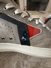 These are high-top sneakers by Christian Dior in gray leather suede. They feature a lace-up closure and a comfortable leather lining. The shoes are in size 45 (equivalent to US 12) and were made in Italy. The design is casual and stylish, suitable for everyday wear. some scuffs on leather and sole , minor dusting on rubber bottom. Velcro straps at top of shoes. please see pics, Free shipping to the US