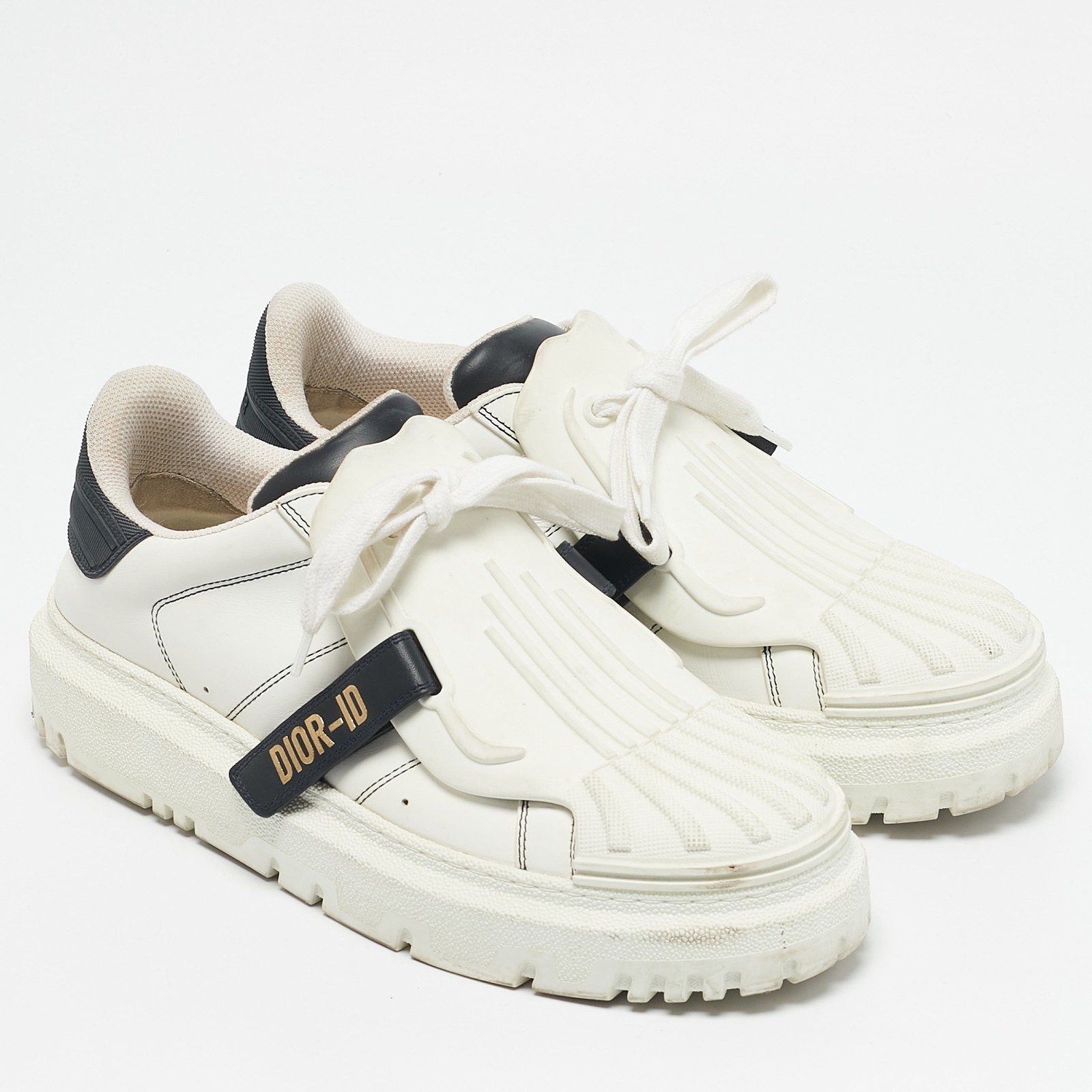 Give your outfit a luxe update with this pair of designer sneakers. The creation is sewn perfectly to help you make a statement in them for a long time.Certified by The Luxury Closet - This item has gone through a detailed authentication process overseen by our experts. We offer a lifetime guarantee of authenticity on all our items. Import duties, taxes and charges are not included in the item price. These charges are the buyers responsibility. Please check with your country’s customs office to determine what these additional cost will be prior to buying. Our eBay Store About Us Contact Us Add to Favorite Sellers Dior White/Navy Blue Leather and Rubber Dior ID Lace Up Sneakers Size 40 $896.5 Give your outfit a luxe update with this pair of designer sneakers. The creation is sewn perfectly to help you make a statement in them for a long time. Product Details Brand Color White Dimensions Material Leather, Rubber Size 40 Outsole Width Outsole Length Heel Height Includes Certified by The Luxury Closet This item has gone through a detailed authentication process overseen by our experts. We offer a lifetime guarantee of authenticity on all our items. How We Check The in-house team of experts at The Luxury Closet is highly trained to verify the authenticity and the condition of the luxury products. They ensure that only 100% authentic items are put on sale.The evaluation process is unique with its own mix of assessment criteria and differs according to the category. Each item is evaluated based on the following combination of hallmarks, hardware, stitching, symmetry, material, craftsmanship, stamping, codes, hologram stickers, and packaging. Our authenticators also check if the items have been modified or amended (e.g., aftermarket diamonds, replaced batteries, repaired bags, etc.) International Buyers Import duties, taxes and charges are not included in the item price. These charges are the buyers responsibility. Please check with your country’s customs office to determine what these additional cost will be prior to buying.