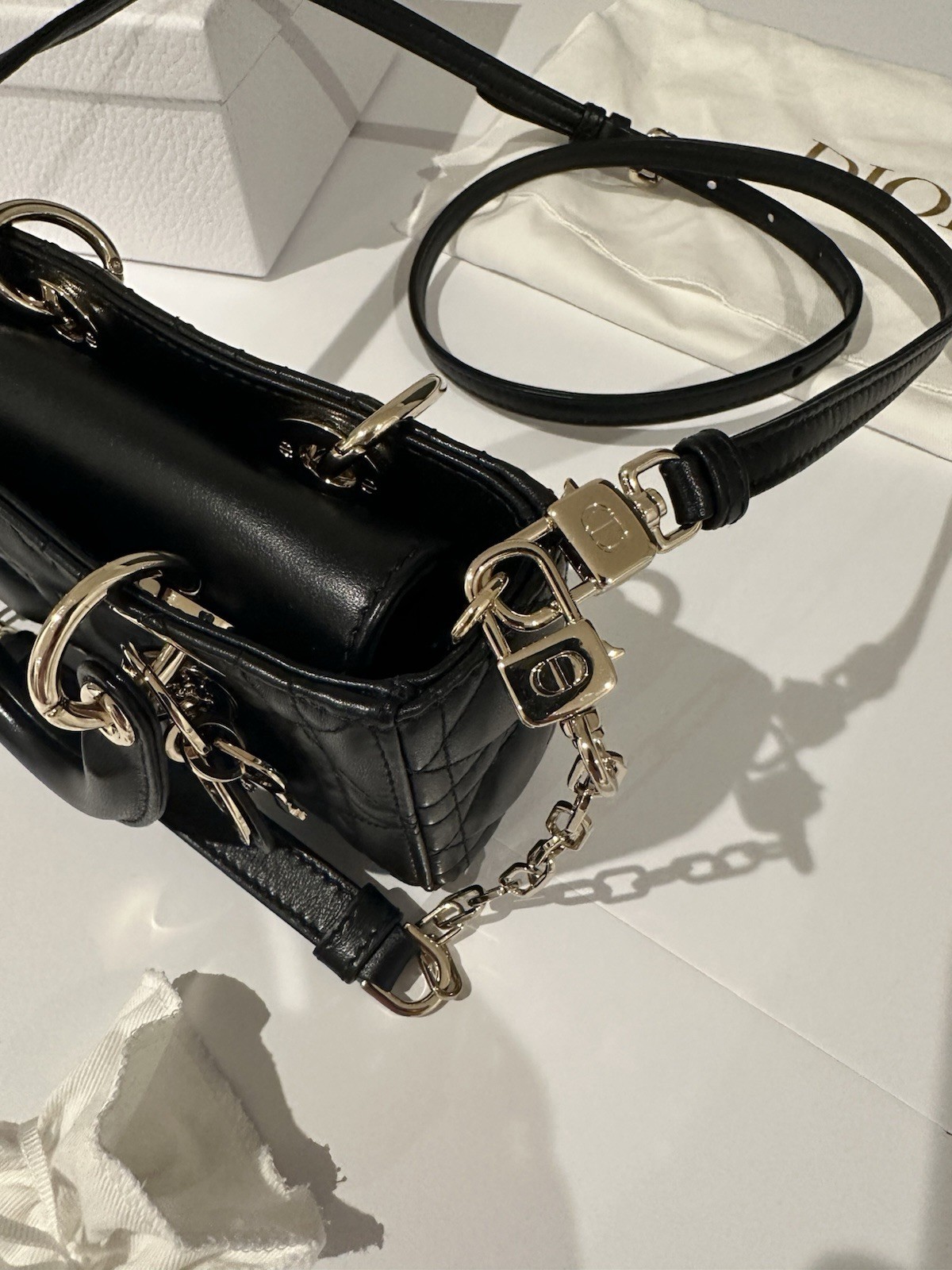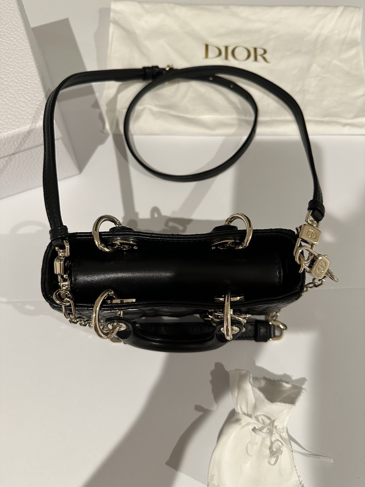 Authentic Dior Lady D-Joy Micro Bag - Black Cannage Lambskin - Gold Hardware Up for sale is a stunning and authentic Christian Dior Lady D-Joy Micro Bag in luxurious black Cannage lambskin leather , complete with gold-tone hardware and the signature 'D.I.O.R.' charm. This elegant and compact silhouette is Dior’s refined take on the iconic Lady Dior line — a collector’s must-have and perfect for evening outings or stylish daily wear. This was purchased for my wife on our wedding anniversary in Paris Dior. She has used it once and then kept in the dust bag and box since. Product Details: Model: Lady D-Joy Micro Bag Color: Black Material: Cannage-stitched Lambskin Leather Hardware: Gold-Tone Metal Carried: Top handles or with adjustable removable crossbody strap Interior: Smooth black leather with slip pocket Closure: Zip closure Measurements (approx.): 16 x 9 x 5 cm / 6.3 x 3.5 x 2 in Made in: Italy Retail Price: $3500 USD Includes: Dior Box Dust Bag Authenticity Card Removable Chain Strap Condition: Excellent pre-owned condition with minimal signs of wear. Used once and stored with care. Please refer to all photos for a close-up view of the condition — all images are of the actual item you will receive. 100% Authentic. This was purchased in person at the Dior store in Paris. This will go through Ebay Authentication first and then sent to the buyer. There will be no discussion in terms of authenticity as it will be authenticated prior to getting into your hands!!
