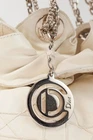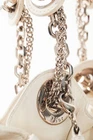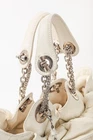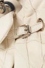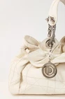 Made in Italy, this Le Trente bag from Christian Dior circa 2009 is crafted with the designer's Cannage leather in a creamy white, and features silver-tone hardware, two top flat chained handles with toggles at the bases, a ruffled elasticized top, buckled strap detailing, a removable D-motif keychain, a slouchy body, and protective bottom feet. The top magnetic snap closure opens to a beige textile-lined interior containing a single zip pocket. Condition: Great; some discolouration and marking throughout leather, light scratching and wear on hardware, light marking on interior. Approximate measurements: Height: 8.5" (21.5 cm) Width: 14" (35.5 cm) Depth: 5.5" (14 cm) Handle Drop: 6" (15 cm) Composition: Leather, textile lining, metal hardware.