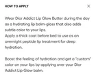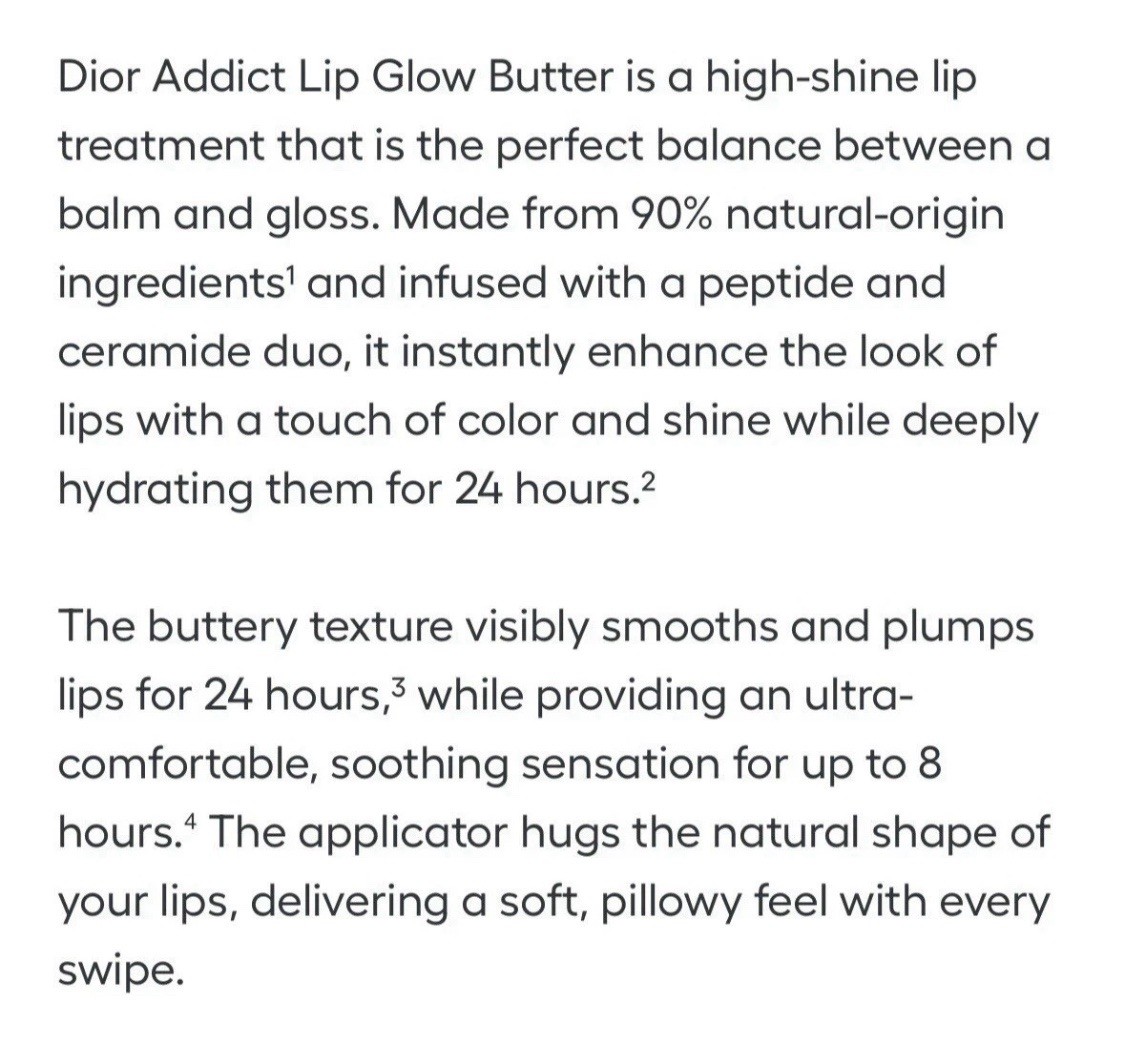 Authentic Dior 2025 collection New in box Includes original Dior pouch DESCRIPTION Dior Addict Lip Glow Butter is a high-shine lip treatment that is the perfect balance between a balm and gloss. Made from 90% natural-origin ingredients' and infused with a peptide and ceramide duo, it instantly enhance the look of lips with a touch of color and shine while deeply hydrating them for 24 hours. The buttery texture visibly smooths and plumps lips for 24 hours,3 while providing an ultra-comfortable, soothing sensation for up to 8 hours. * The applicator hugs the natural shape of your lips, delivering a soft, pillowy feel with every swipe. The peptide and ceramide duo supports the skin barrier and helps smooth and protect lips from external stressors. Cherry oil helps maintain hydration and gives a plumping effect. Made with 90% natural-origin ingredients. HOW TO APPLY Wear Dior Addict Lip Glow Butter during the day as a hydrating lip balm-gloss that also adds subtle color to your lips. Apply a thick coat before bed to use as an overnight peptide lip treatment for deep hydration. Boost the feeling of hydration and get a "custom" color on your lips by applying over your Dior Addict Lip Glow balm.