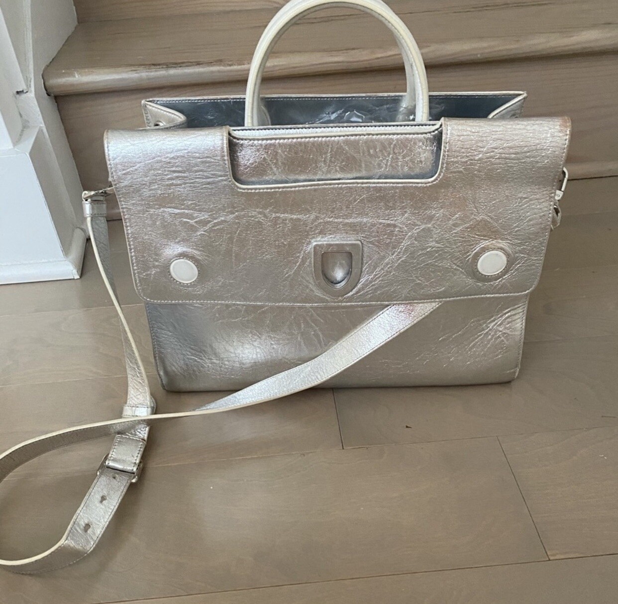 Christian Dior Metallic Calfskin Large Diorever Bag Silver. Year: 2016 Base length: 13.25 in Height: 9.5 in Width: 6.5 in Drop: 3 in Drop: 17.5 in This is an authentic CHRISTIAN DIOR Metallic Calfskin Large Diorever Flap in Silver. This chic handbag is composed of crushed calfskin leather in metallic silver. This handbag features white rolled leather top handles, a metallic silver shoulder strap, and silver hardware. The facing flap opens with a textured press lock to a matching leather interior with patch pockets. Please see photos of pockets where it is discolored on the inside and not noticeable when carrying.