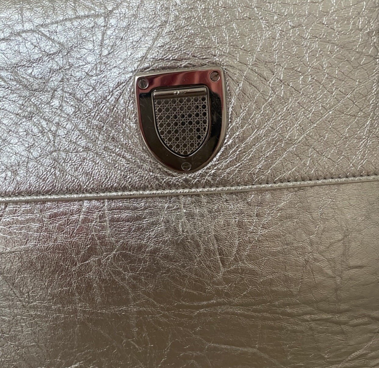 This stunning Dior Diorever bag is a true showstopper! The metallic silver calfskin leather has a luxurious crushed texture that catches the light beautifully. The spacious interior with handy patch pockets makes it practical, while the dual top handles and detachable shoulder strap offer versatile carrying options. The silver hardware and textured press lock add elegant details—perfect for elevating any outfit. A timeless yet statement-making piece that feels both modern and classic. Love how it transitions effortlessly from day to night!