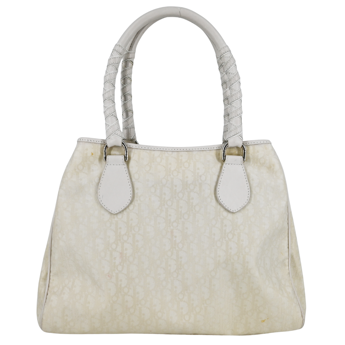 Dior Off-White Monogram Nylon Lovely Shoulder Bag Condition is Pre-Owned. Used, with major stains & wear throughout the upper materials. Visible tarnishing & scratches at the hardware. Stains, scuff marks, & wear at the leather trim & handles. DETAILS Top leather rolled stitched leather handles Snap button strap closure at the top Off-white monogram canvas upper Off-white leather trim Silver-tone DIOR charm at the front Beige nylon interior lining Single interior zipper pocket Dual interior slit pockets Made in Italy MATERIALS Canvas / Leather MEASUREMENTS Height: 10 in. Length: 12.5 in. Width: 4 in. Handle Drop: 6.5 in. *Please note that pre-owned items are not new and therefore might have minor imperfections. Measurements are approximate and the product may have slight disparities in person.
