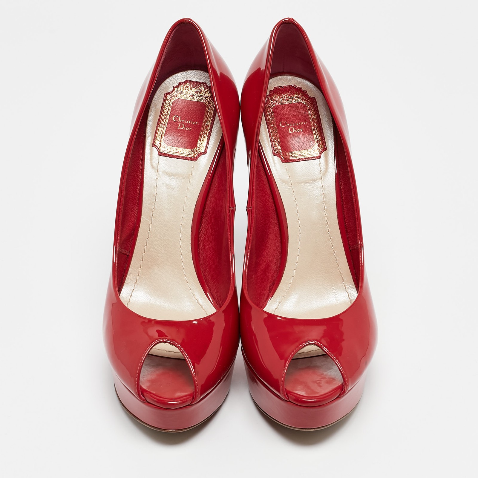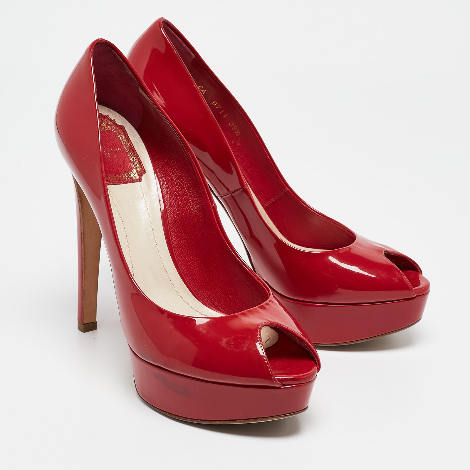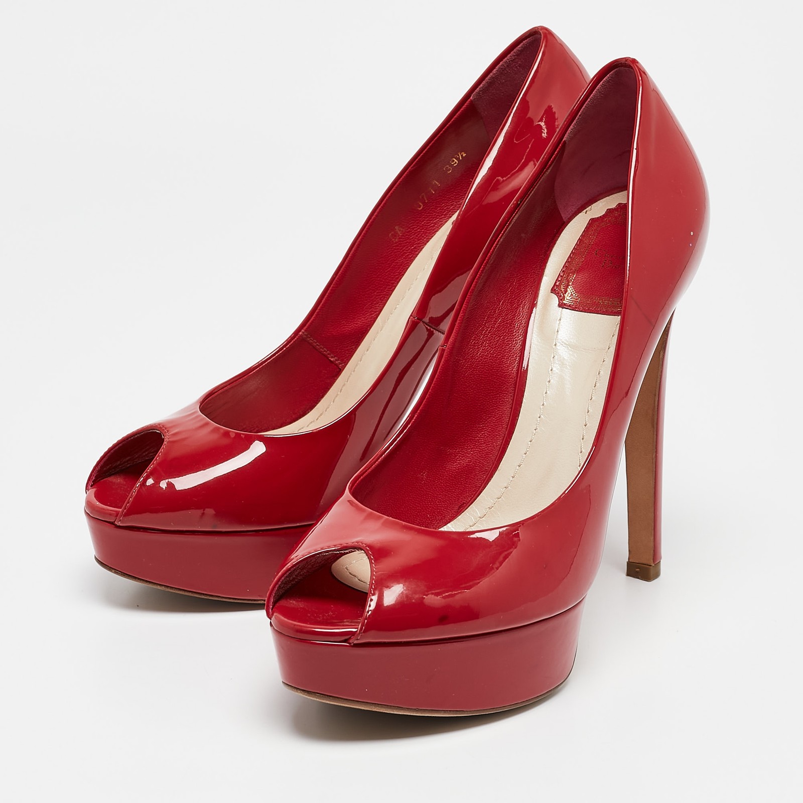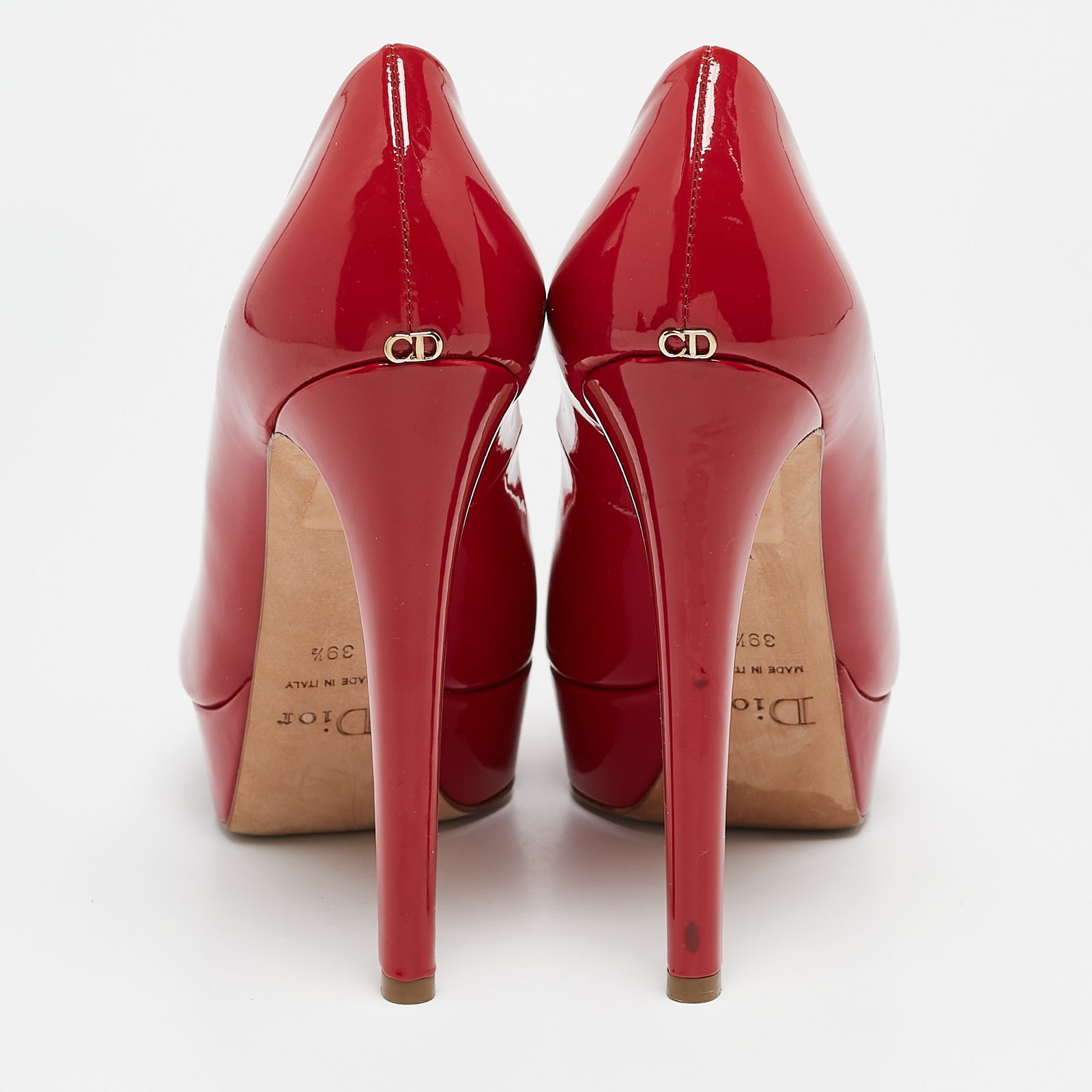 A classic pair of pumps to have in your closet, are these Dior Pumps. Crafted from red patent leather, they feature a smooth glossy exterior. They have peep toe caps, 12.5cm heels, brand label on the back and platforms.Certified by The Luxury Closet - This item has gone through a detailed authentication process overseen by our experts. We offer a lifetime guarantee of authenticity on all our items. Import duties, taxes and charges are not included in the item price. These charges are the buyers responsibility. Please check with your country’s customs office to determine what these additional cost will be prior to buying. Our eBay Store About Us Contact Us Add to Favorite Sellers Dior Red Patent Leather Miss Dior Peep Toe Platform Pumps Size 39.5 $179.3 A classic pair of pumps to have in your closet, are these Dior Pumps. Crafted from red patent leather, they feature a smooth glossy exterior. They have peep toe caps, 12.5cm heels, brand label on the back and platforms. Product Details Brand Color Red Dimensions Material Patent Leather Size 39.5 Outsole Width Outsole Length Heel Height 12.5 cm Includes The Luxury Closet Packaging Certified by The Luxury Closet This item has gone through a detailed authentication process overseen by our experts. We offer a lifetime guarantee of authenticity on all our items. How We Check The in-house team of experts at The Luxury Closet is highly trained to verify the authenticity and the condition of the luxury products. They ensure that only 100% authentic items are put on sale.The evaluation process is unique with its own mix of assessment criteria and differs according to the category. Each item is evaluated based on the following combination of hallmarks, hardware, stitching, symmetry, material, craftsmanship, stamping, codes, hologram stickers, and packaging. Our authenticators also check if the items have been modified or amended (e.g., aftermarket diamonds, replaced batteries, repaired bags, etc.) International Buyers Import duties, taxes and charges are not included in the item price. These charges are the buyers responsibility. Please check with your country’s customs office to determine what these additional cost will be prior to buying.